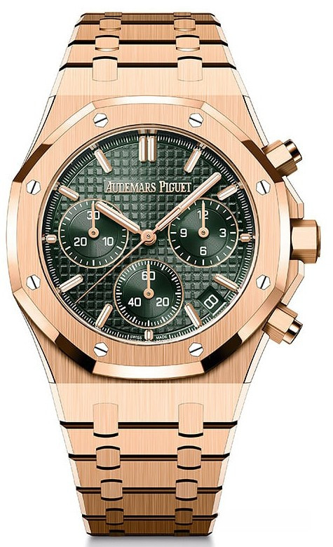 Часы Audemars Piguet Royal Oak Selfwinding Chronograph 41 mm 2022 представлены в корпусе размером 41 х 12.4 мм из розового золота 18к водонепроницаемостью 50 метров. Внутри корпуса установлен автоматический механизм, Калибр AP 4401, обладающий запасом хода 40 часов. На зеленом гильошированном циферблате отображаются часы, минуты, секунды, дата. Часы поставляются на браслете из розового золота 18к.