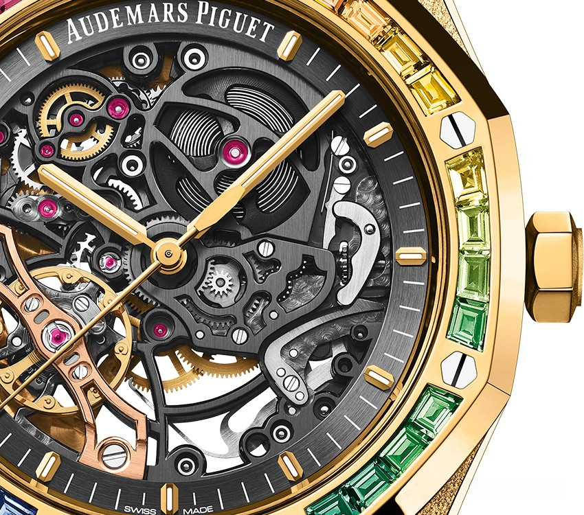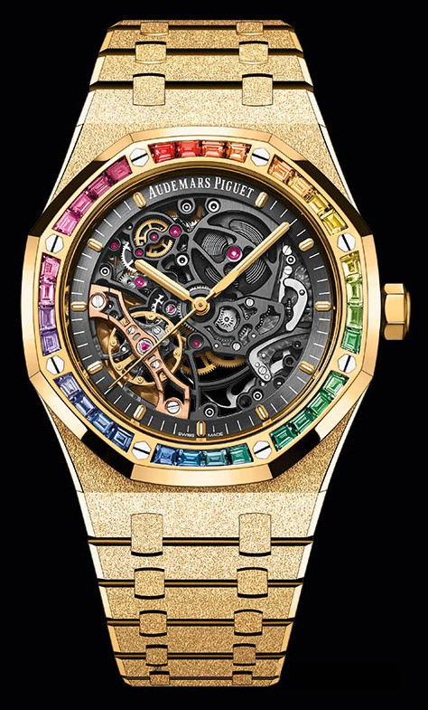 Часы Audemars Piguet Royal Oak Double Balance Wheel Openworked представлены в корпусе из желтого золота 18к размером 37 мм и водонепроницеамостью 50 метров. Внутри корпуса установлен автоматический механизм, Калибр 3132, с запасом хода 45 часов. На черном скелетированном циферблате при помощи золотых стрелок отображаются часы, минуты и секунды. Часы комплектуются браслетом из желтого золота 18к. Безель из разноцветных драгоценных камней.