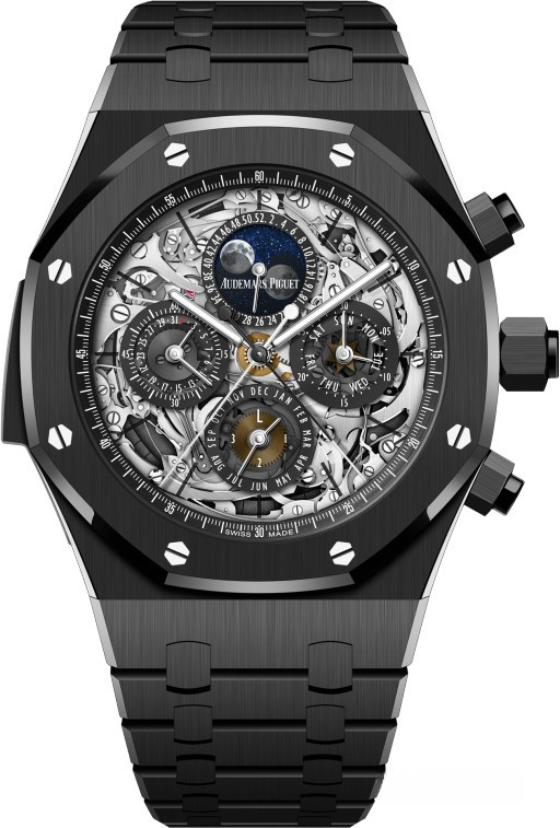 Часы Audemars Piguet Royal Oak Grande Complication выпущены в корпусе из керамики, размером 44 х 15.1 мм и водонепроницаемостью 20 м. Внутри корпуса установлен автоматический механизм, Калибр АР 2885. На серебристом циферблате отображаются часы, минуты, секунды, дата, день недели, неделя, месяц, фаза луны, цикл високосного года. Запас хода 50 часов. Часы комплектуются браслетом из керамики.