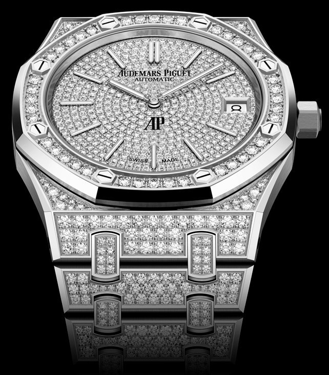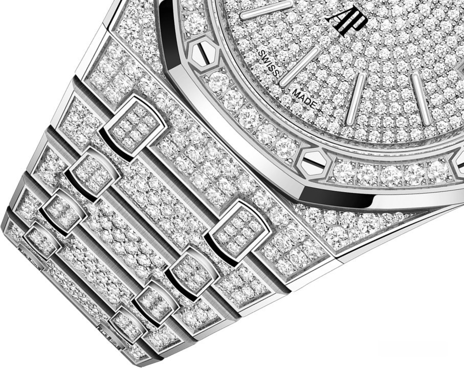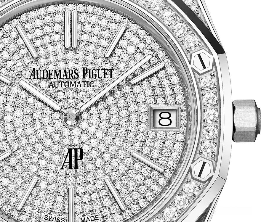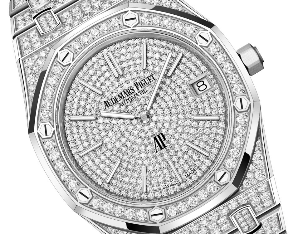 Часы Audemars Piguet Royal Oak Jumbo Extra-Thin 39 mm представлены в корпусе размером 39 х 8.1 мм из белого золота 18к водонепроницаемостью 50 метров. Внутри корпуса установлен автоматический механизм, Калиб 7121, обладающий запасом хода 55 часов. На циферблате с белыми бриллиантами отображаются часы, минуты, дата. Часы поставляются с браслетом из белого золота 18к, инкрустированным белыми бриллиантами. Безель из белых бриллиантов.