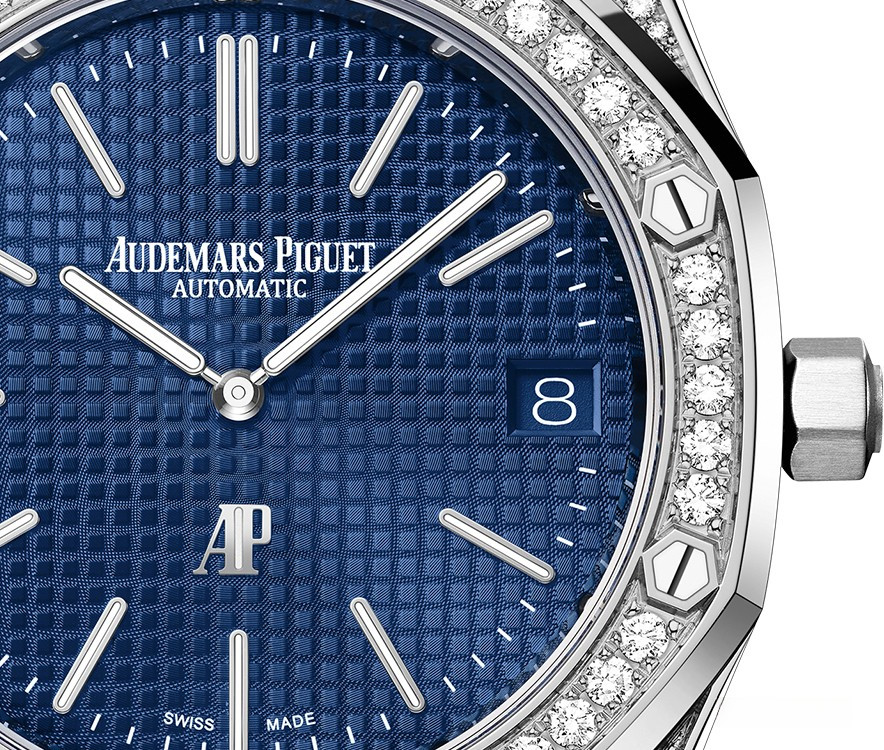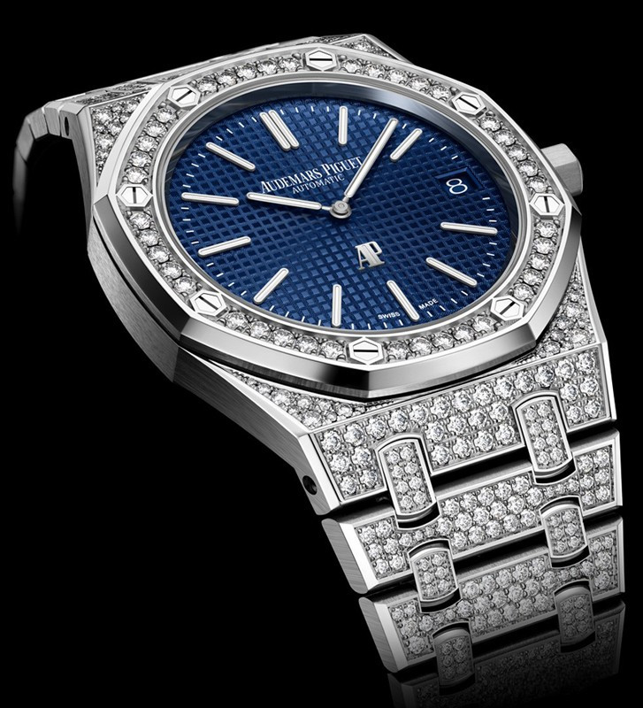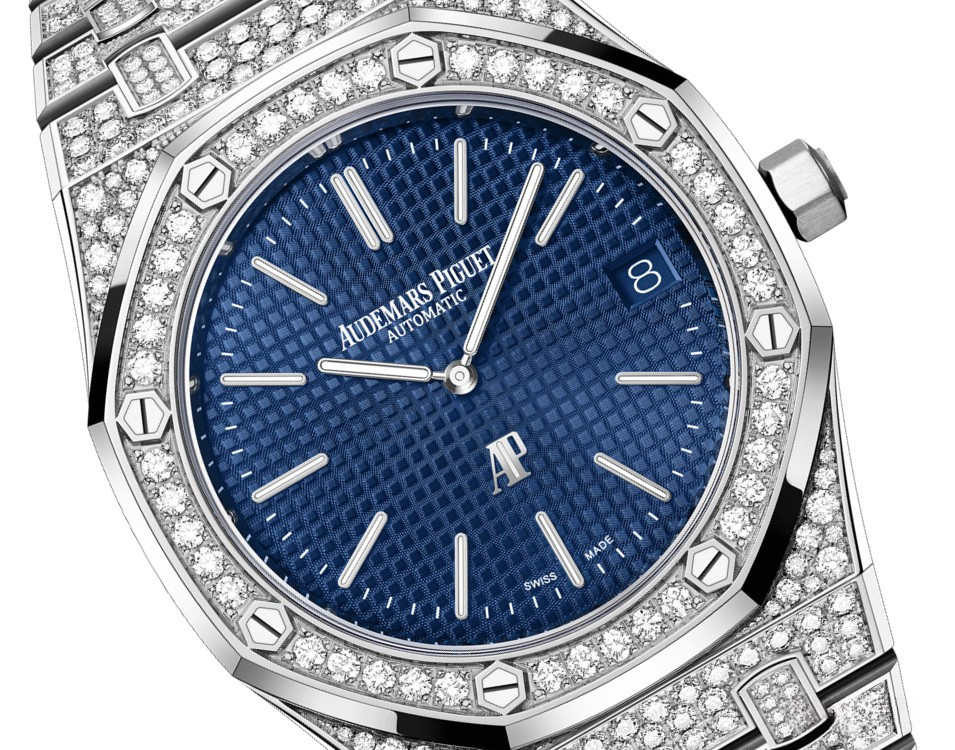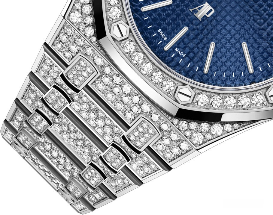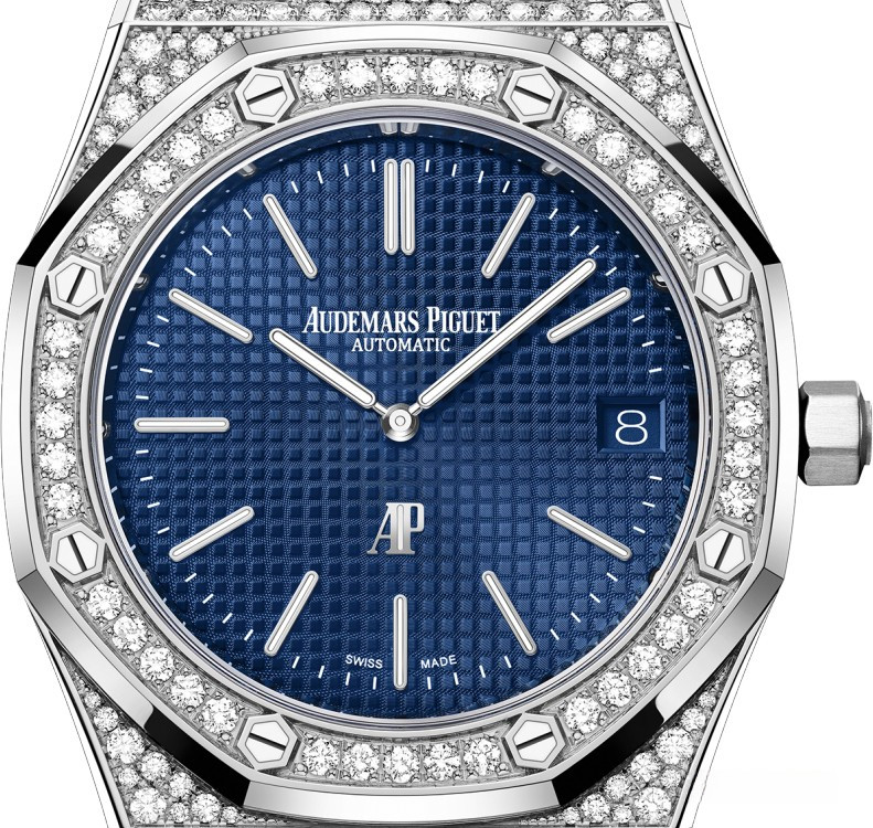 Часы Audemars Piguet Royal Oak Jumbo Extra-Thin 39 mm представлены в корпусе размером 39 х 8.1 мм из белого золота 18к водонепроницаемостью 50 метров. Внутри корпуса установлен автоматический механизм, Калиб 7121, обладающий запасом хода 55 часов. На синем циферблате отображаются часы, минуты, дата. Часы поставляются с браслетом из белого золота 18к, инкрустированным белыми бриллиантами. Безель из белых бриллиантов.