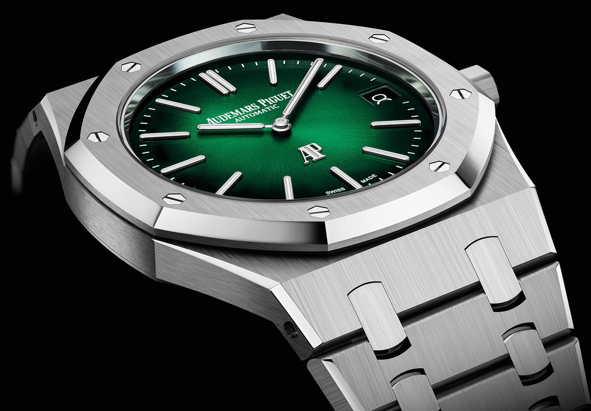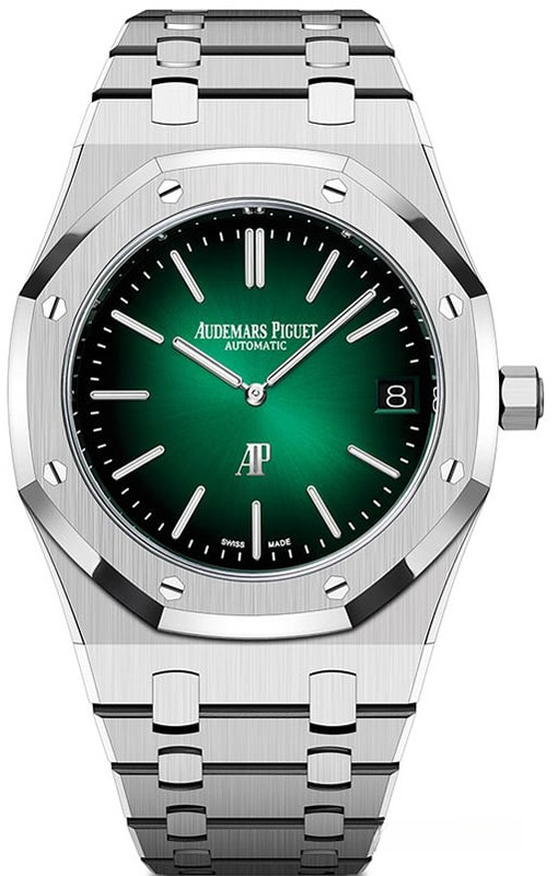 Часы Audemars Piguet Royal Oak Jumbo Extra-Thin 39 mm представлены в корпусе размером 39 х 8 мм из платины 950 водонепроницаемостью 50 метров. Внутри корпуса установлен автоматический механизм, Калиб 7121, обладающий запасом хода 55 часов. На зеленом циферблате отображаются часы, минуты, дата. Часы поставляются с платиновым браслетом.