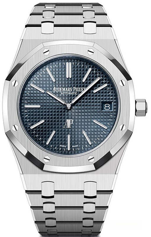 Часы Audemars Piguet Royal Oak Jumbo Extra-Thin 39 mm представлены в корпусе размером 39 х 8 мм из нержавеющей стали водонепроницаемостью 50 метров. Внутри корпуса установлен автоматический механизм, Калиб 7121, обладающий запасом хода 55 часов. На синем гильошированном циферблате отображаются часы, минуты, дата. Часы поставляются с браслетом из нержавеющей стали.
