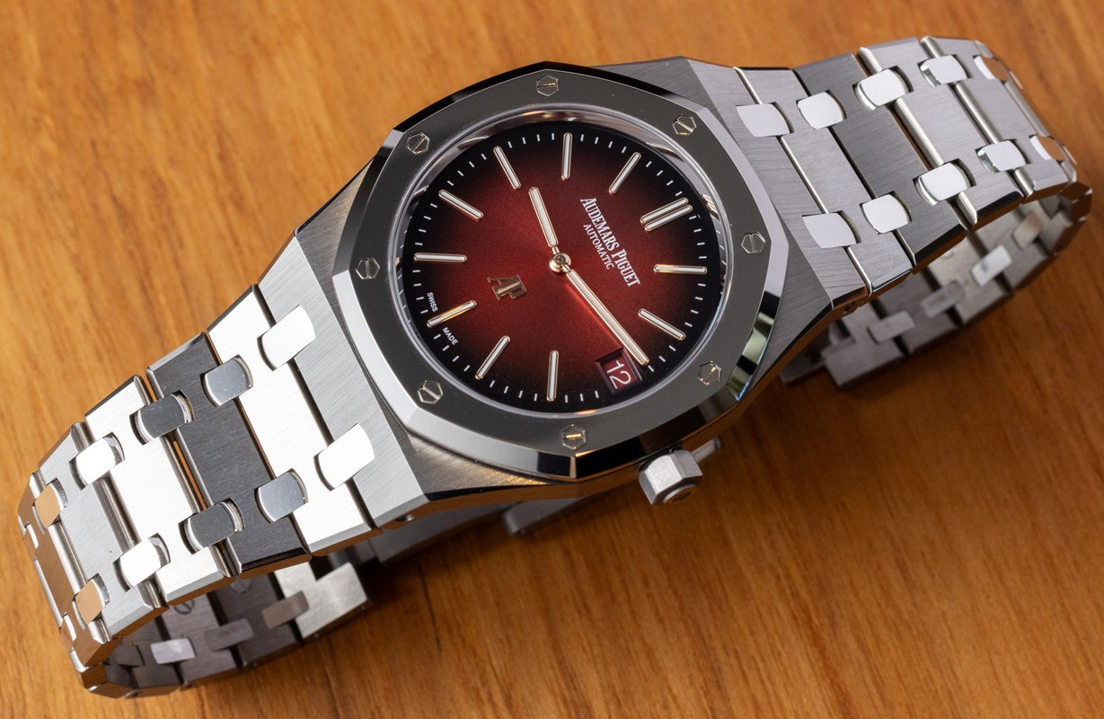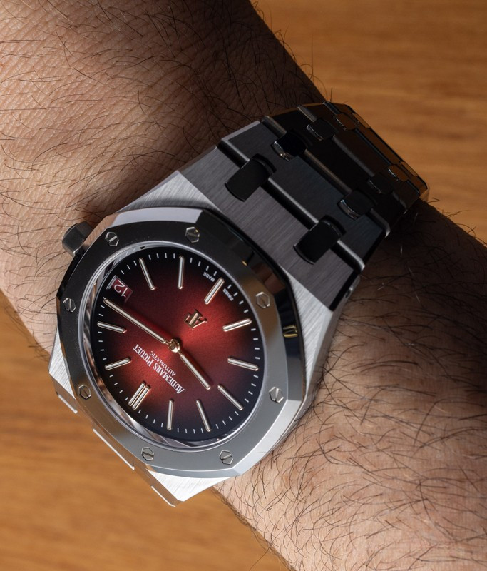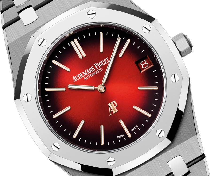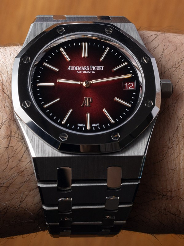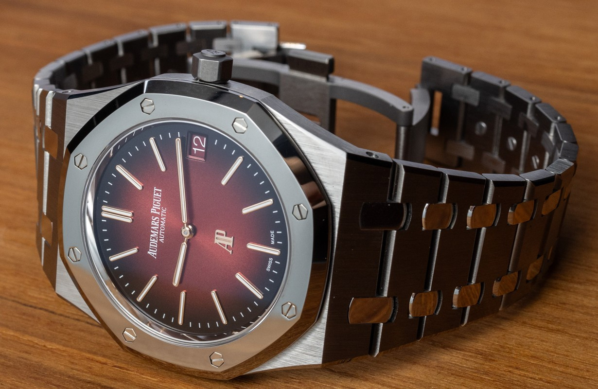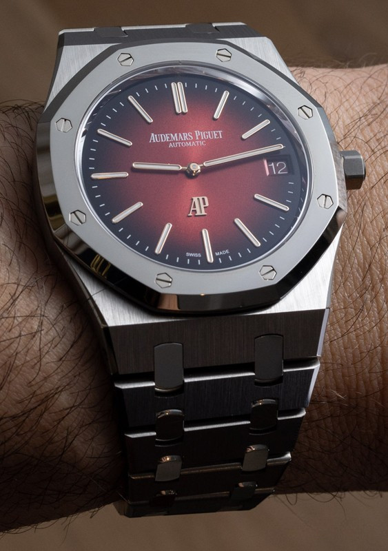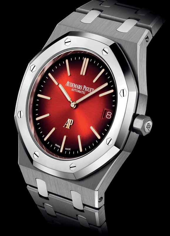 Часы Audemars Piguet Royal Oak Jumbo Extra-Thin 39 mm представлены в корпусе размером 39 х 8.1 мм из титана водонепроницаемостью 50 метров. Внутри корпуса установлен автоматический механизм, Калиб 7121, обладающий запасом хода 55 часов. На красном циферблате отображаются часы, минуты, дата. Часы поставляются с браслетом из титана.