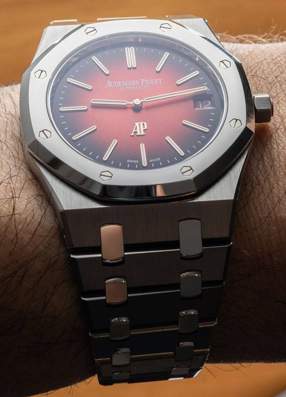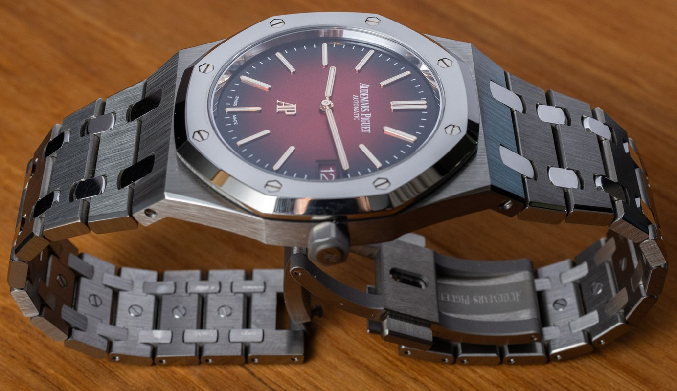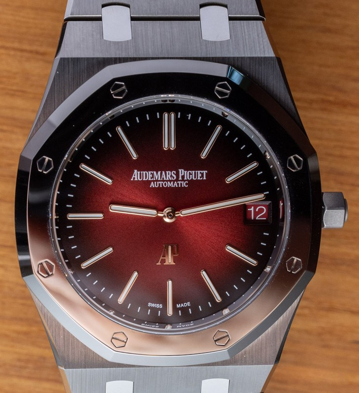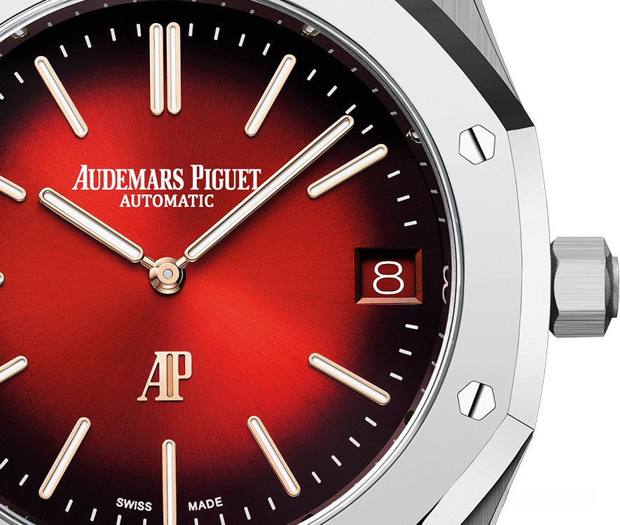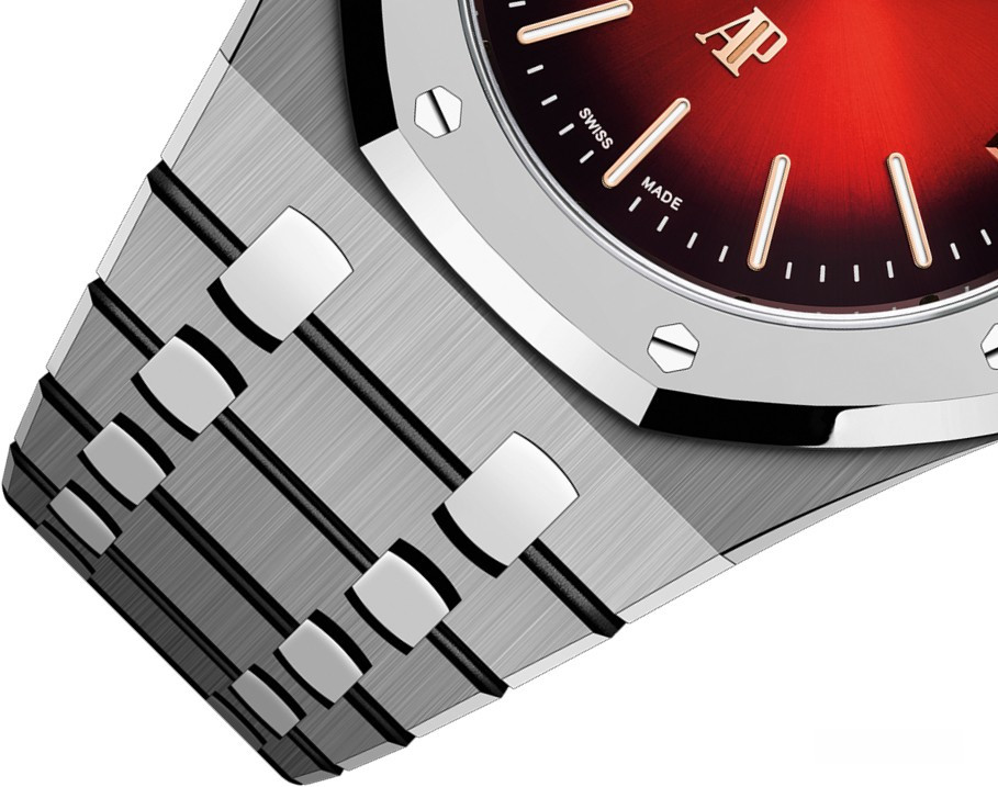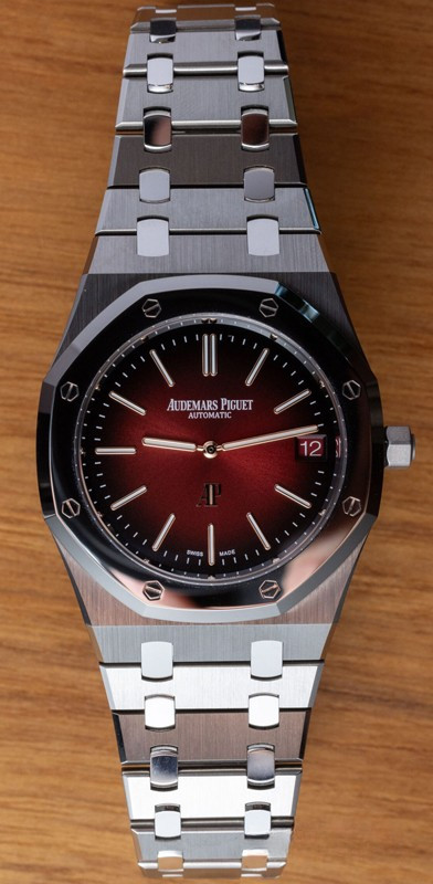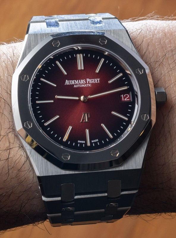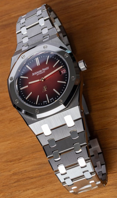 Часы Audemars Piguet Royal Oak Jumbo Extra-Thin 39 mm представлены в корпусе размером 39 х 8.1 мм из титана водонепроницаемостью 50 метров. Внутри корпуса установлен автоматический механизм, Калиб 7121, обладающий запасом хода 55 часов. На красном циферблате отображаются часы, минуты, дата. Часы поставляются с браслетом из титана.