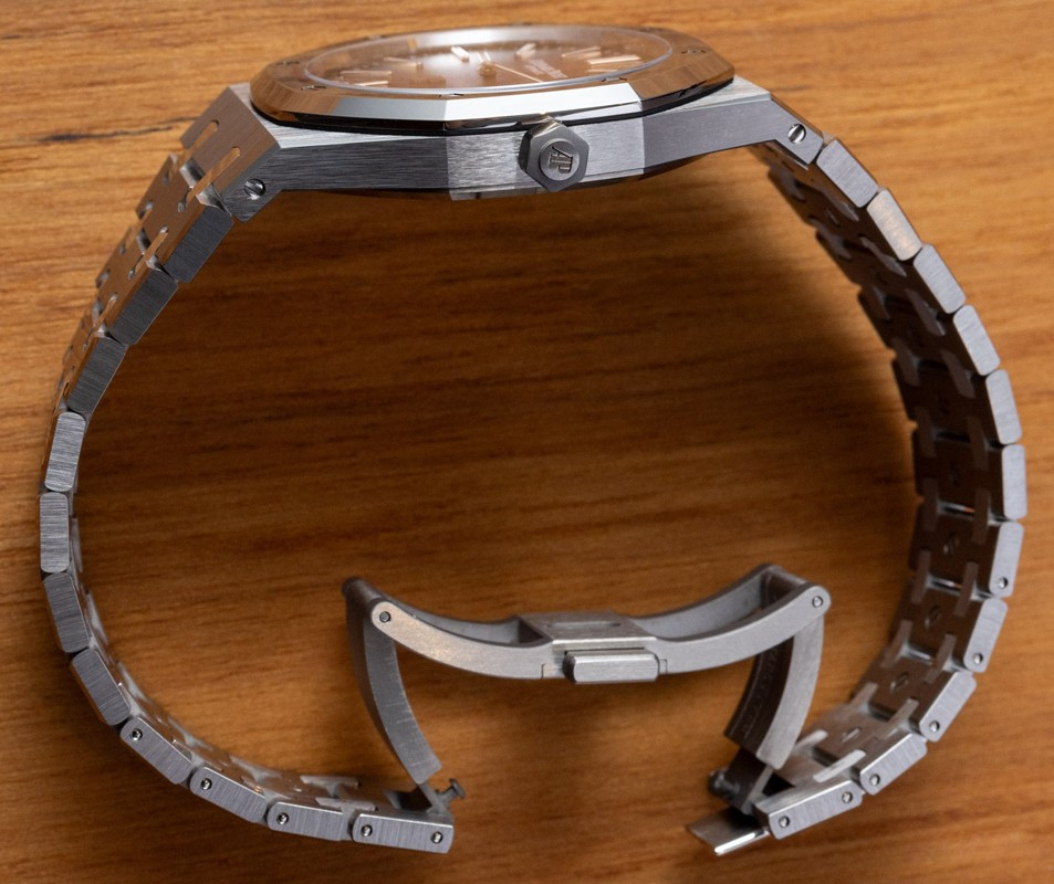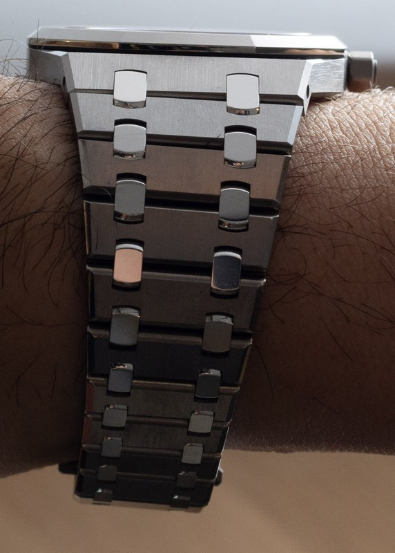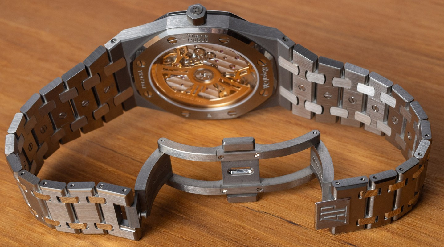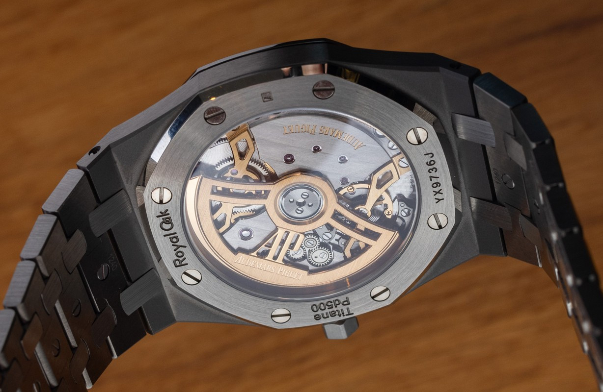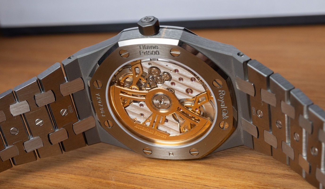 Часы Audemars Piguet Royal Oak Jumbo Extra-Thin 39 mm представлены в корпусе размером 39 х 8.1 мм из титана водонепроницаемостью 50 метров. Внутри корпуса установлен автоматический механизм, Калиб 7121, обладающий запасом хода 55 часов. На красном циферблате отображаются часы, минуты, дата. Часы поставляются с браслетом из титана.
