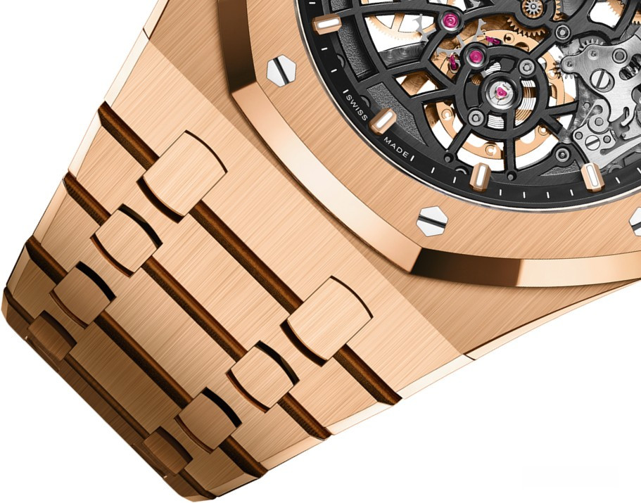 Часы Audemars Piguet Royal Oak Jumbo Extra-Thin Openworked представлены в корпусе размером 39 x 8.1 мм из розового золота 18к водонепроницаемостью 50 метров. Внутри корпуса установлен автоматический механизм, Калибр El Primero 7124, обладающий запасом хода 57 часов. На черном циферблате отображаются часы, минуты. Часы поставляются на браслете из розового золота 18к.