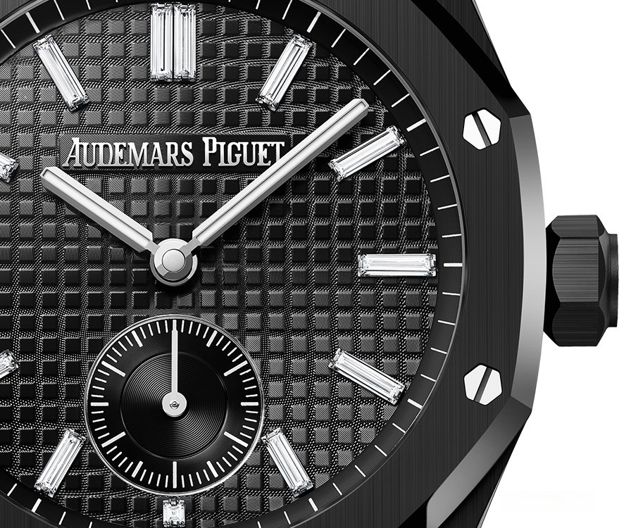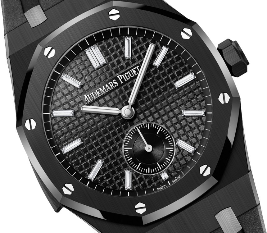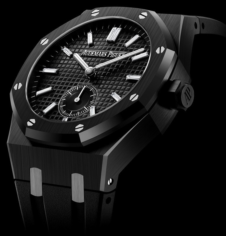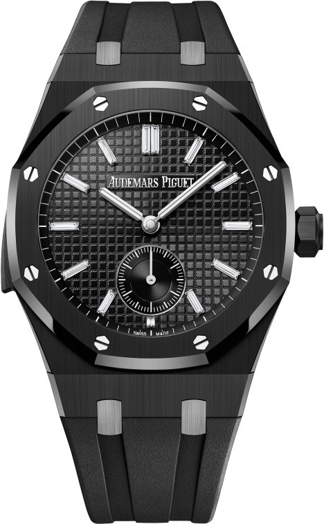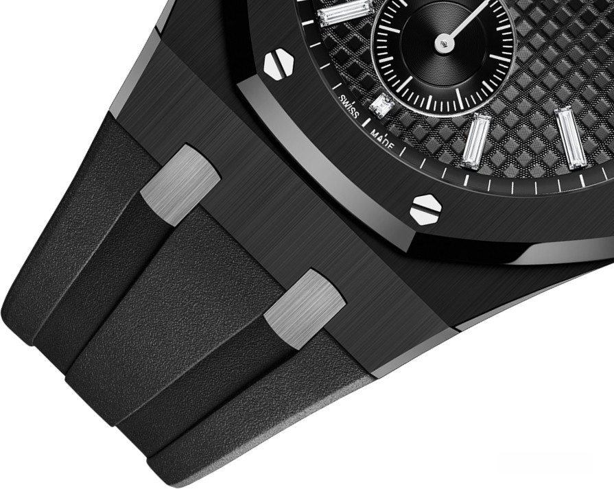 Часы Audemars Piguet Royal Oak Minute Repeater Supersonnerie представлены в корпусе из керамики размером 42 х 14 мм и водонепроницаемостью до 20 метров. Внутри корпуса установлен механизм с ручным заводом, Калибр 2959 с запасом хода 72 часа. На черном циферблате с белыми багетными бриллиантами отображаются часы, минуты, секунды. Часы комплектуются каучуковым ремешком с титановой застежкой.