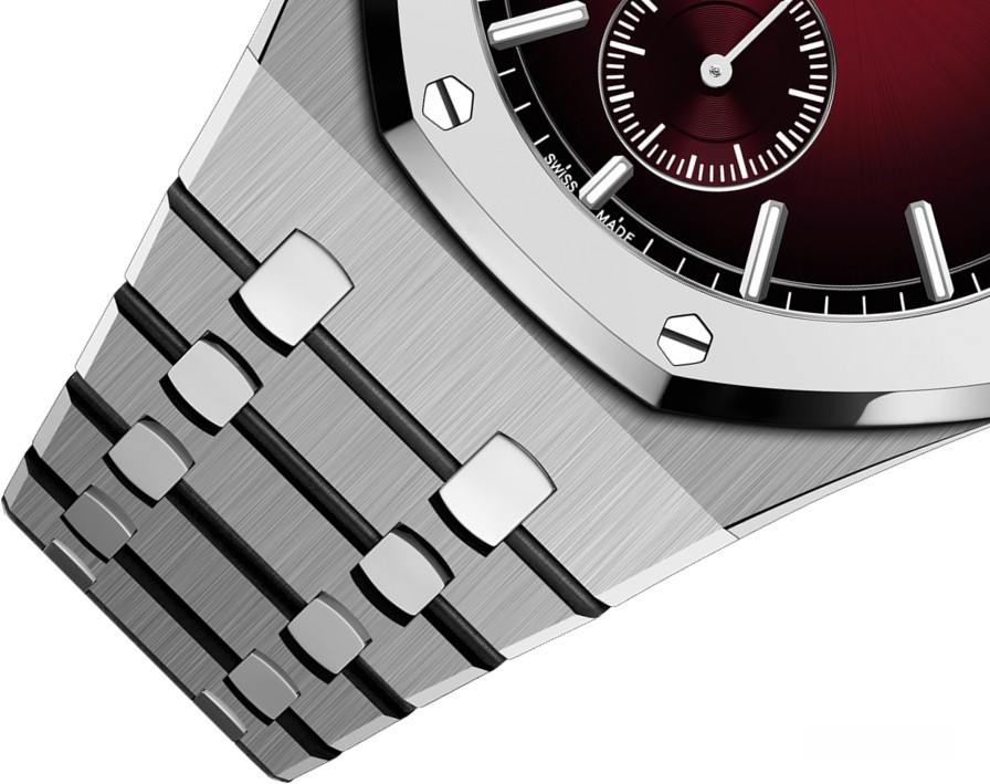 Часы Audemars Piguet Royal Oak Minute Repeater Supersonnerie представлены в корпусе из титана и платины размером 42 х 14 мм и водонепроницаемостью до 20 метров. Внутри корпуса установлен механизм с ручным заводом, Калибр 2959 с запасом хода 72 часа. На бордовом циферблате отображаются часы, минуты, секунды. Часы комплектуются браслетом из титана и платины.