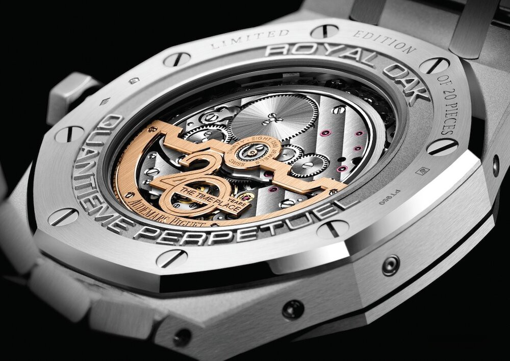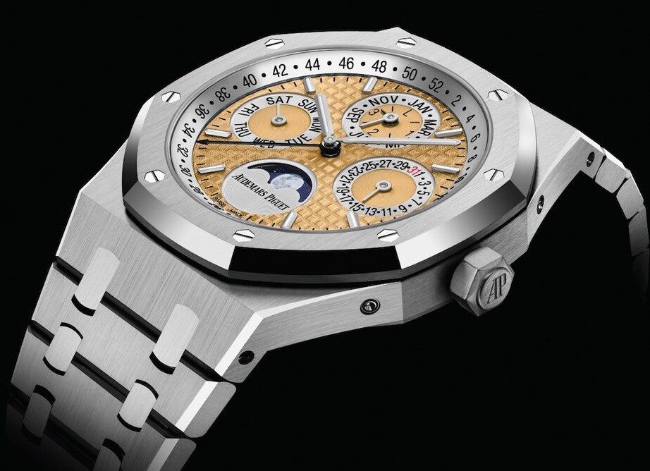 Audemars Piguet Royal Oak Perpetual Calendar представлен в новом, платиновом корпусе. Поверхности сохраняют классический дизайн Royal Oak с полированными фасками по бокам и матовыми поверхностями плоских частей корпуса и браслета. Циферблат золотистого цвета с узором Grande Tapisserie. Фаза Луны отображается при помощи объемного изображения, нанесенного на авантюрин. Внутри корпуса установлен ультратонкий автоматический Калибр 5134. Он создан на основе культового Калибра 2120, к которому добавлен сложный модуль QP с индикацией даты, дня недели, месяца, номера недели, високосного года и фазой луны. Механизм, финишированный в лучших традициях высокого часового искусства, виден через заднюю крышку сапфирового стекла.