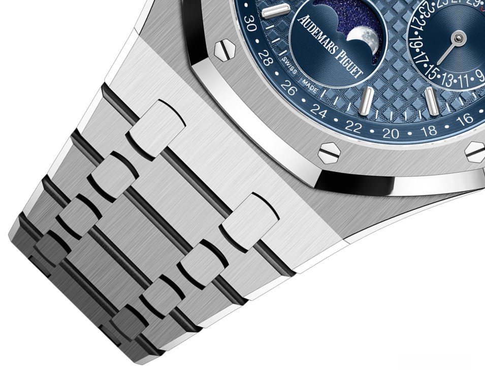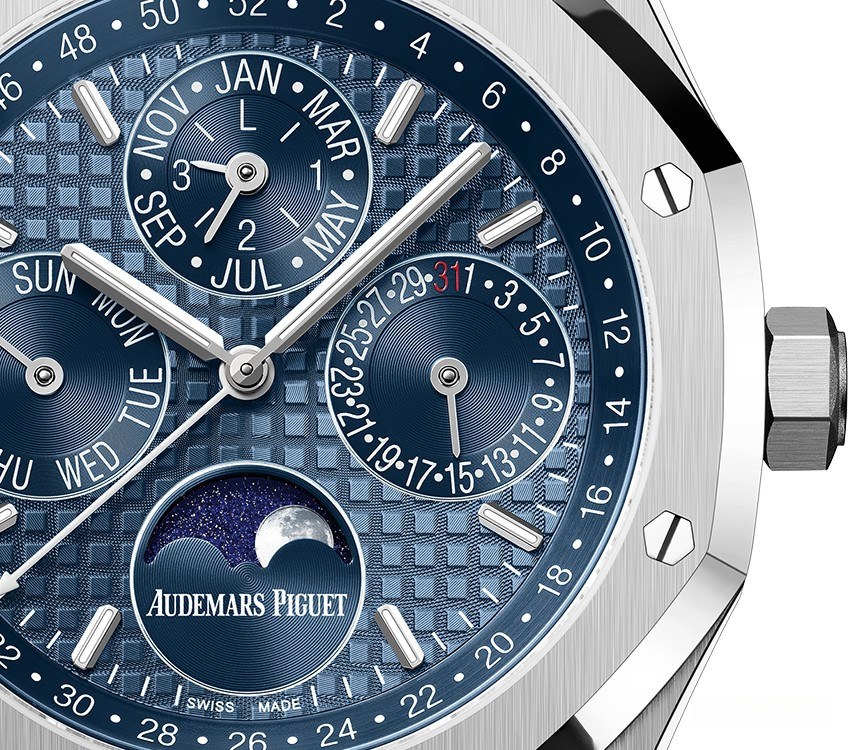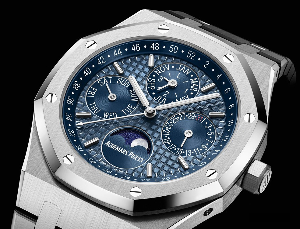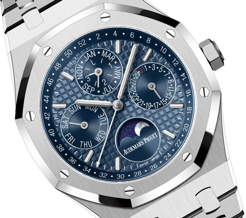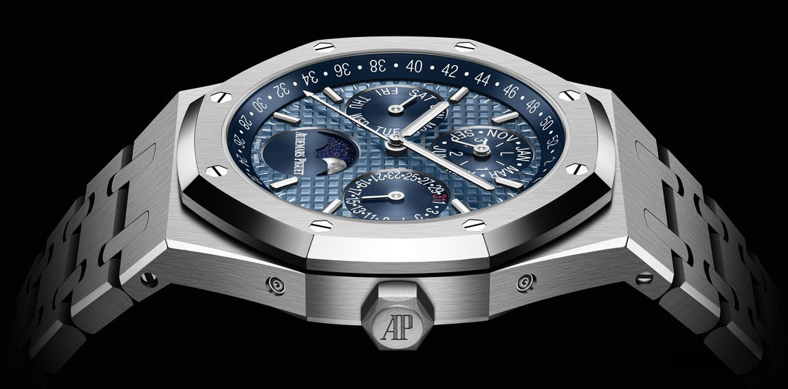 Audemars Piguet Royal Oak Perpetual Calendar представлен в корпусе из нержавеющей стали. Поверхности сохраняют классический дизайн Royal Oak с полированными фасками по бокам и матовыми поверхностями плоских частей корпуса и браслета. Циферблат синего цвета с узором Grande Tapisserie. Фаза Луны отображается при помощи объемного изображения, нанесенного на авантюрин. Внутри корпуса установлен ультратонкий автоматический Калибр 5134. Он создан на основе культового Калибра 2120, к которому добавлен сложный модуль QP с индикацией даты, дня недели, месяца, номера недели, високосного года и фазой луны. Механизм, финишированный в лучших традициях высокого часового искусства, виден через заднюю крышку сапфирового стекла.