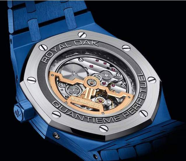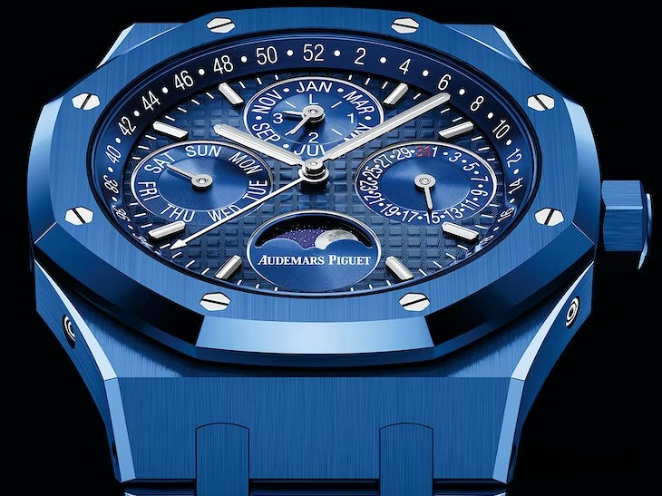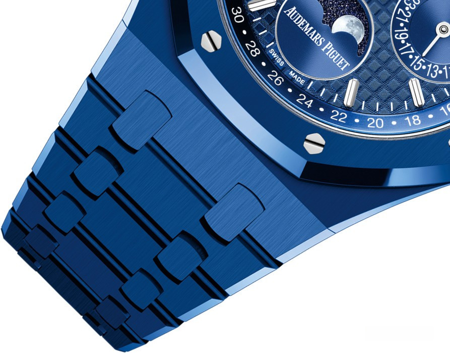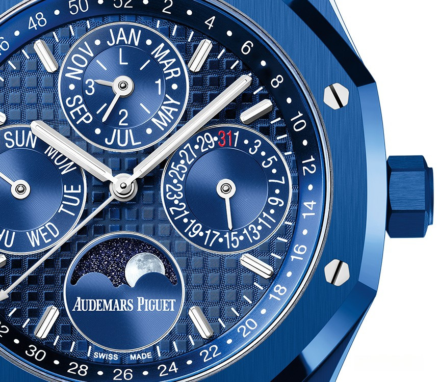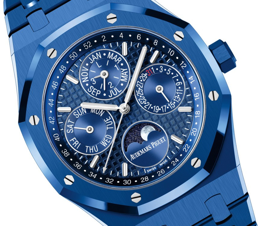 Audemars Piguet Royal Oak Perpetual Calendar представлен в корпусе из керамики. Поверхности сохраняют классический дизайн Royal Oak с полированными фасками по бокам и матовыми поверхностями плоских частей корпуса и браслета. Циферблат синего цвета с узором Grande Tapisserie. Фаза Луны отображается при помощи объемного изображения, нанесенного на авантюрин. Внутри корпуса установлен ультратонкий автоматический Калибр 5134. Он создан на основе культового Калибра 2120, к которому добавлен сложный модуль QP с индикацией даты, дня недели, месяца, номера недели, високосного года и фазой луны. Механизм, финишированный в лучших традициях высокого часового искусства, виден через заднюю крышку сапфирового стекла.