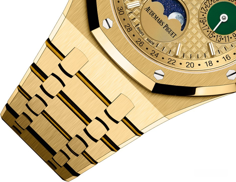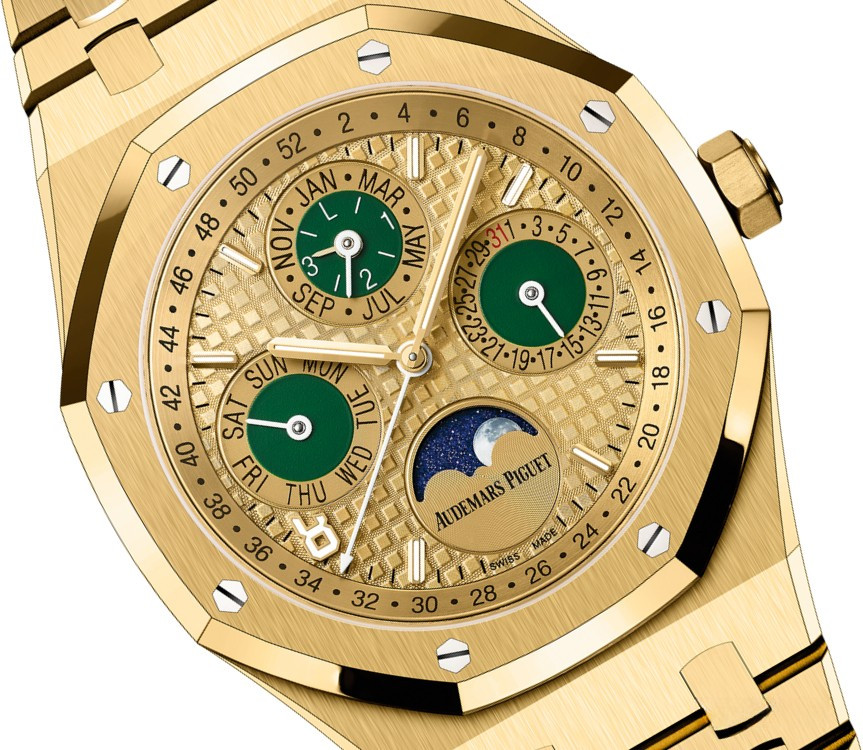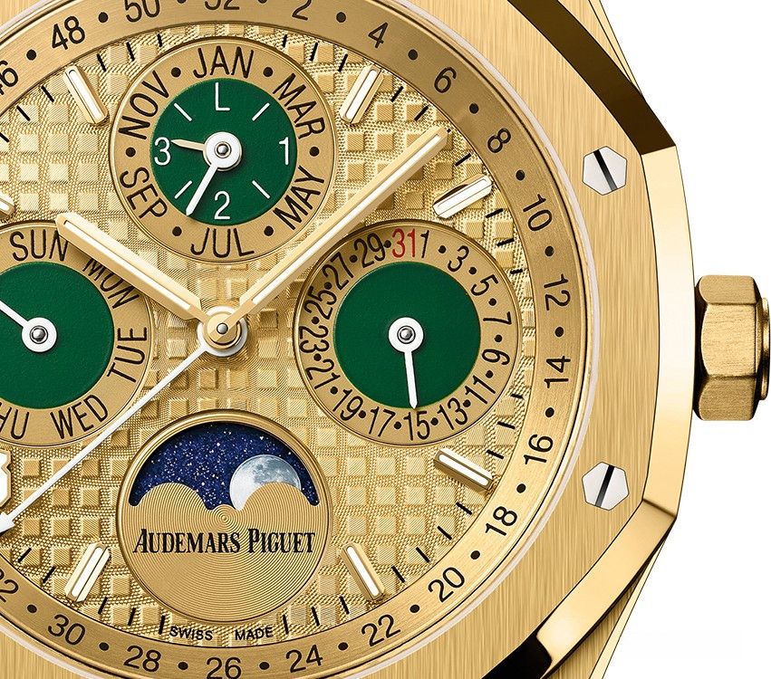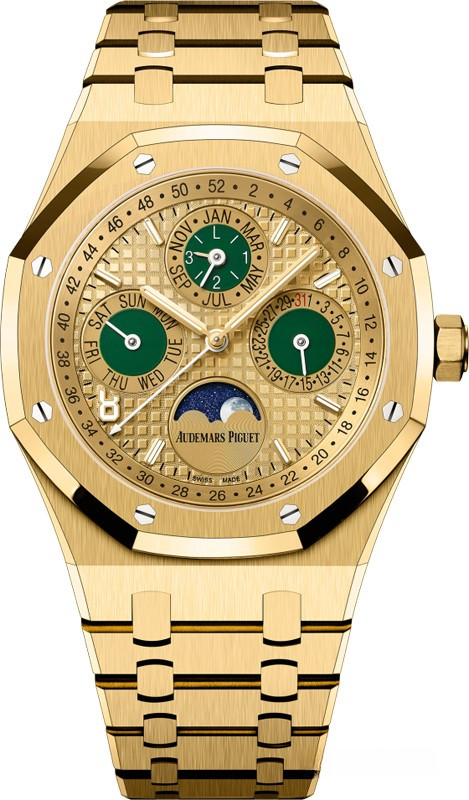 Audemars Piguet Royal Oak Perpetual Calendar представлен в корпусе из желтого золота 18к. Поверхности сохраняют классический дизайн Royal Oak с полированными фасками по бокам и матовыми поверхностями плоских частей корпуса и браслета. Циферблат золотистого цвета с узором Grande Tapisserie. Фаза Луны отображается при помощи объемного изображения, нанесенного на авантюрин. Внутри корпуса установлен ультратонкий автоматический Калибр 5134. Он создан на основе культового Калибра 2120, к которому добавлен сложный модуль QP с индикацией даты, дня недели, месяца, номера недели, високосного года и фазой луны. Механизм, финишированный в лучших традициях высокого часового искусства, виден через заднюю крышку сапфирового стекла.