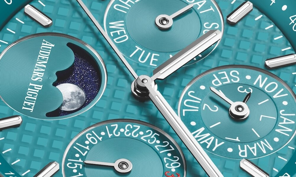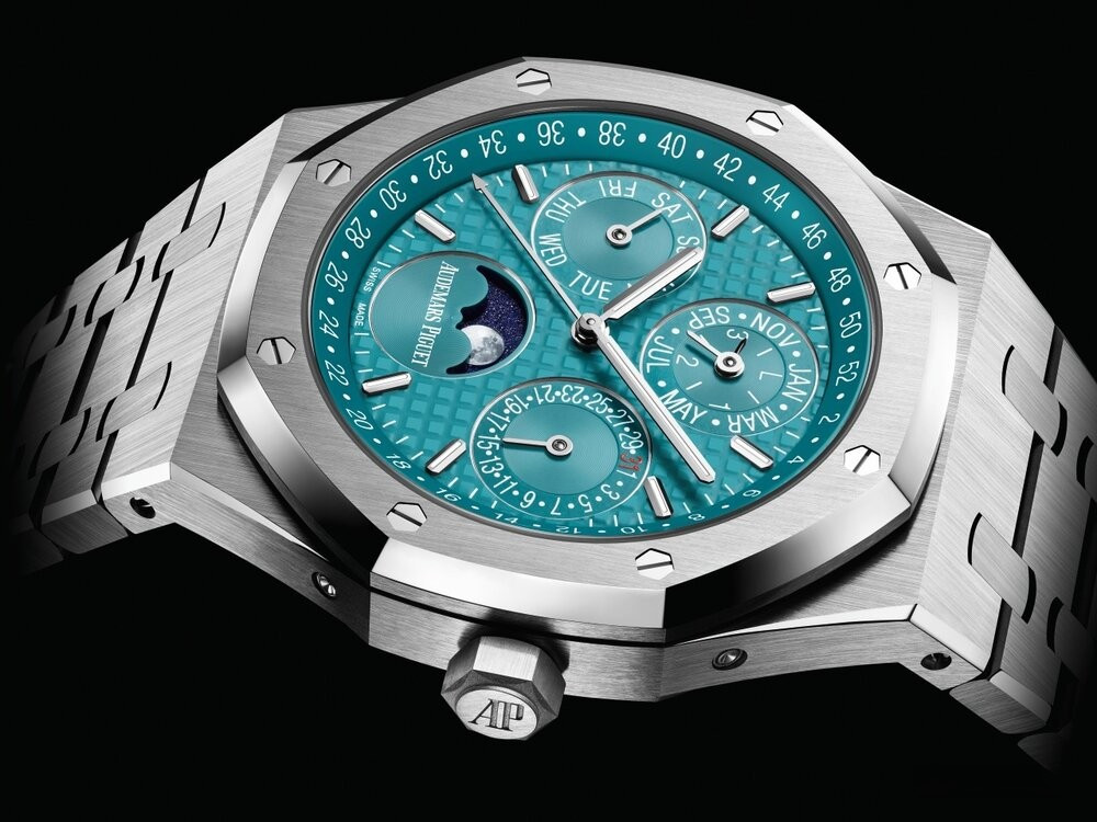 Часы Audemars Piguet Royal Oak Perpetual UAE Limited Edition представлены в корпусе из нержавеющей стали диаметром 41 мм водонепроницаемостью 30 м. Внутри корпуса установлен автоматический механизм, обладающий запасом хода 42 часа. На бирюзовом циферблате отображаются часы, минуты, дата, день недели, месяц, неделя, цикл високосного года, фаза луны. Часы поставляются на браслете из нержавеющей стали. Серия ограничена - 75 шт.