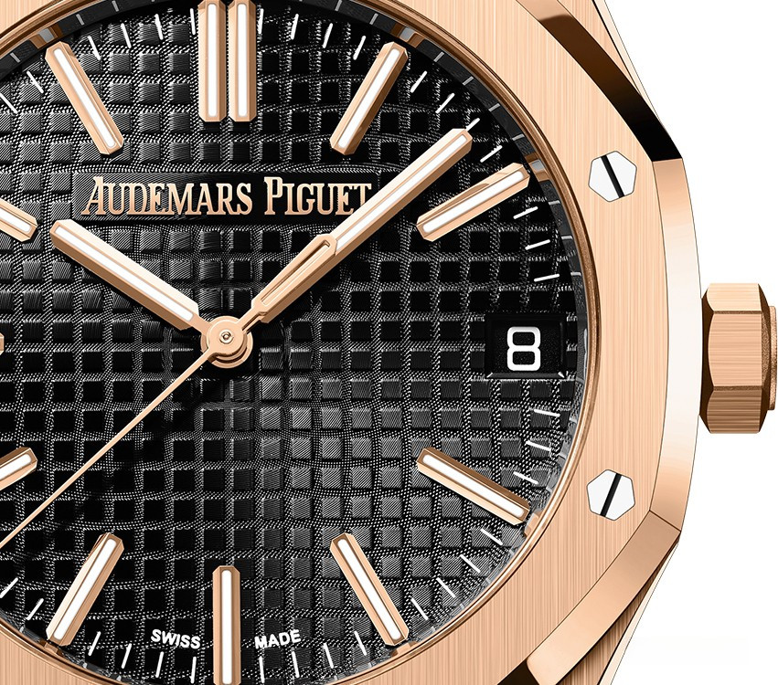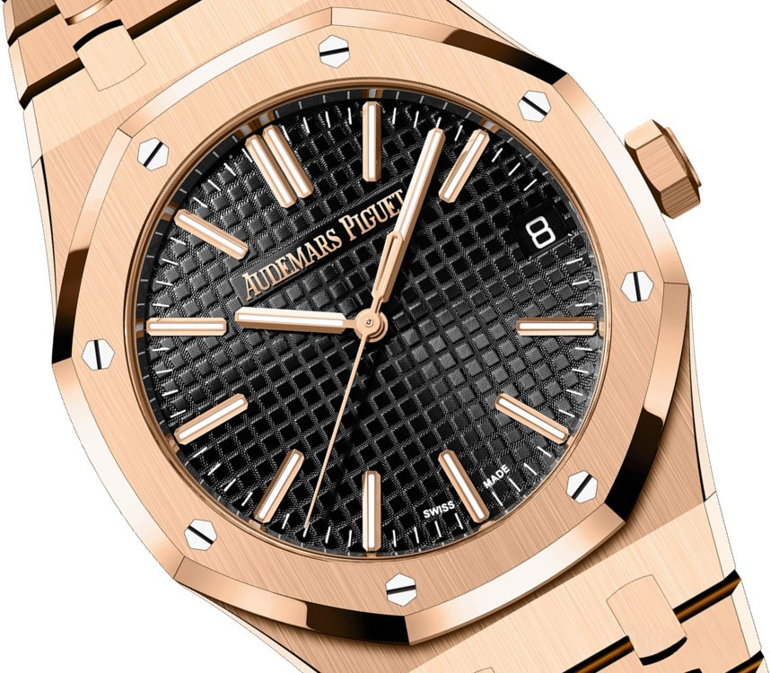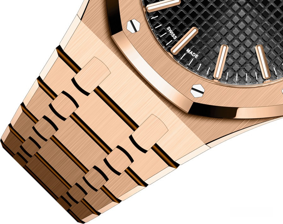 Мужские часы Audemars Piguet Royal Oak Selfwinding 41 mm изготовлены из розового золота 18к, размер корпуса 41 х 10.5 мм, водонепроницаемость до 50 метров. Внутри установлен автоматический механизм, Калибр 4302, с запасом хода 70 часов. На черном гильошированном Grande Tapisserie циферблате отображаются часы, минуты, секунды и дата. Сапфировое стекло с антибликовым покрытием установлено на лицевой части корпуса и на задней его крышке. Часы комплектуются браслетом из розового золота 18к.