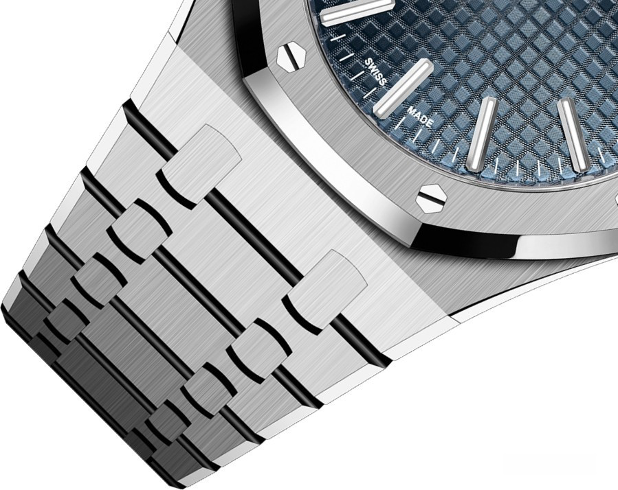 Мужские часы Audemars Piguet Royal Oak Selfwinding 41 mm изготовлены из нержавеющей стали, размер корпуса 41 х 10.5 мм, водонепроницаемость до 50 метров. Внутри установлен автоматический механизм, Калибр 4302, с запасом хода 70 часов. На синем гильошированном Grande Tapisserie циферблате отображаются часы, минуты, секунды и дата. Сапфировое стекло с антибликовым покрытием установлено на лицевой части корпуса и на задней его крышке. Часы комплектуются браслетом из нержавеющей стали.