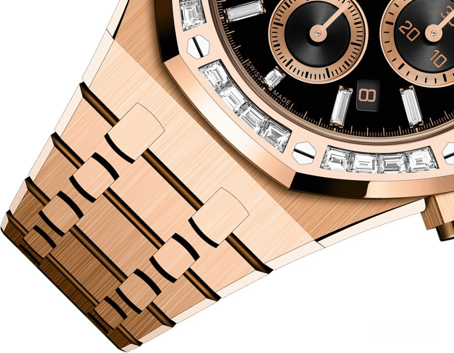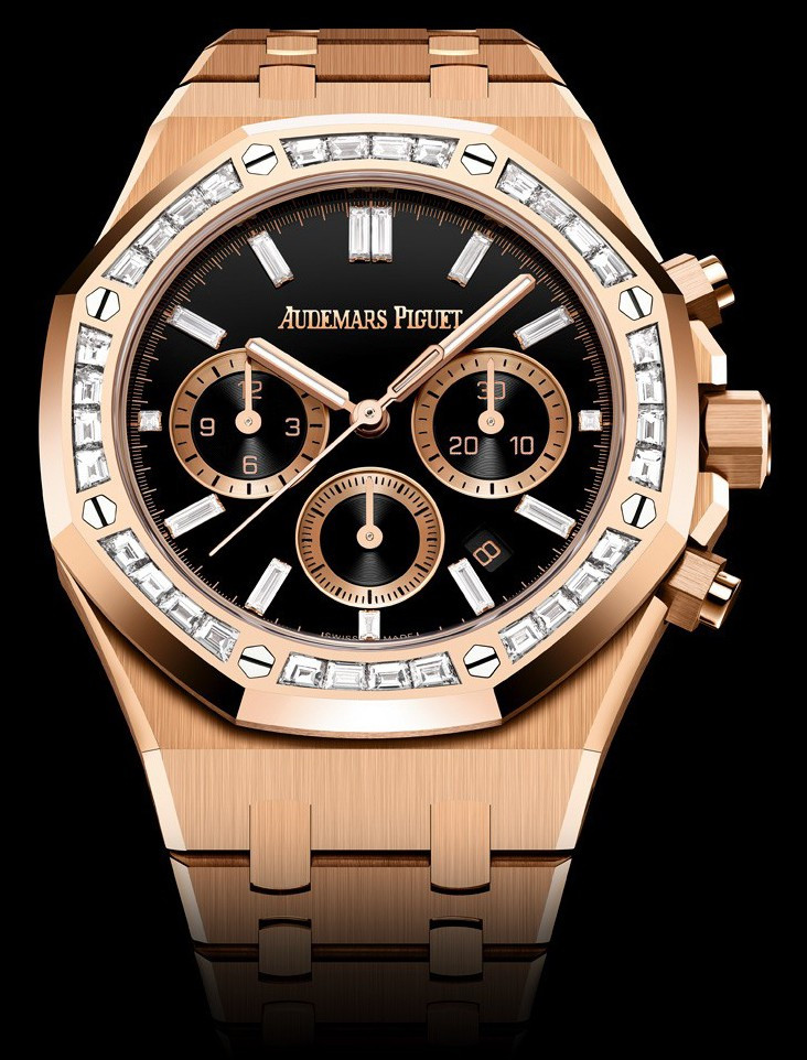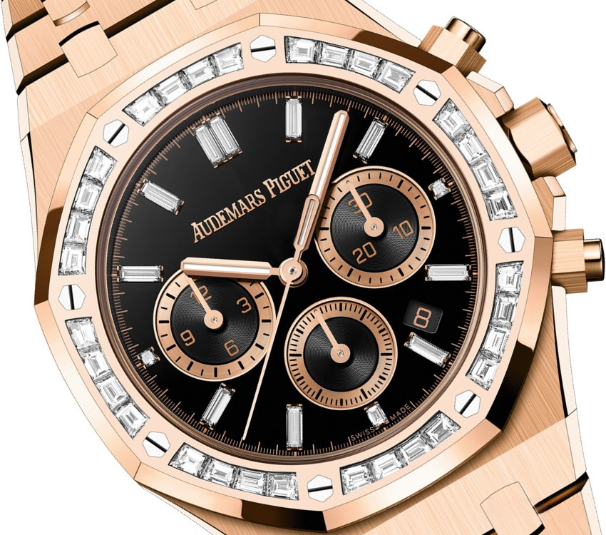 Часы Audemars Piguet Royal Oak Selfwinding Chronograph 38 mm представлены в корпусе размером 38 х 11 мм из розового золота 18к водонепроницаемостью 50 метров. Внутри корпуса установлен автоматический механизм, Калибр AP 2385, обладающий запасом хода 40 часов. На черном гильошированном циферблате с белыми багетными бриллиантами отображаются часы, минуты, секунды, дата. Часы поставляются на браслете из розового золота 18к. Безель из белых багетных бриллиантов.