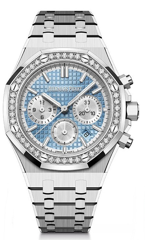Часы Audemars Piguet Royal Oak Selfwinding Chronograph 38 mm 2022 представлены в корпусе размером 38 х 11 мм из нержавеющей стали водонепроницаемостью 50 метров. Внутри корпуса установлен автоматический механизм, Калибр AP 2385, обладающий запасом хода 40 часов. На голубом гильошированном циферблате отображаются часы, минуты, секунды, дата. Часы поставляются на браслете из нержавеющей стали. Безель из белых бриллиантов.