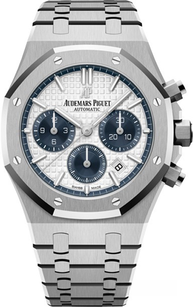 Часы Audemars Piguet Royal Oak Chronograph 38 мм выпущены в корпусе из нержавеющей стали, размером 38 х 11 мм и водонепроницаемостью 50 м. Внутри корпуса установлен автоматический механизм, Калибр 2385. На серебристом с синим гильошированном циферблате отображаются часы, минуты, дата, секунды. Запас хода 40 часов. Часы комплектуются браслетом из нержавеющей стали.