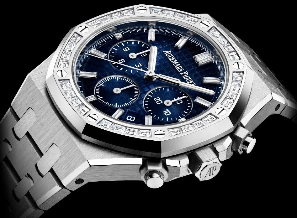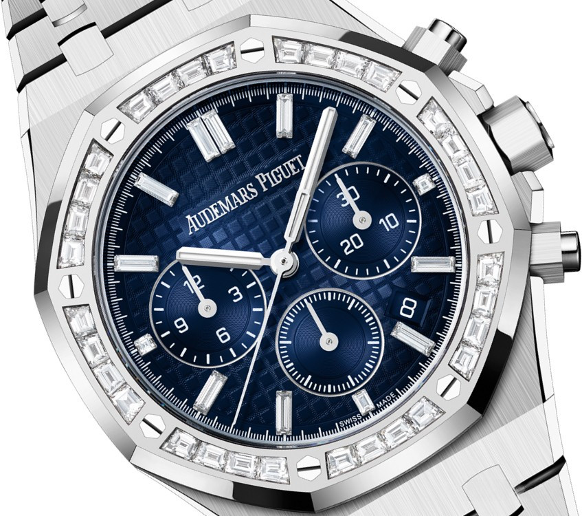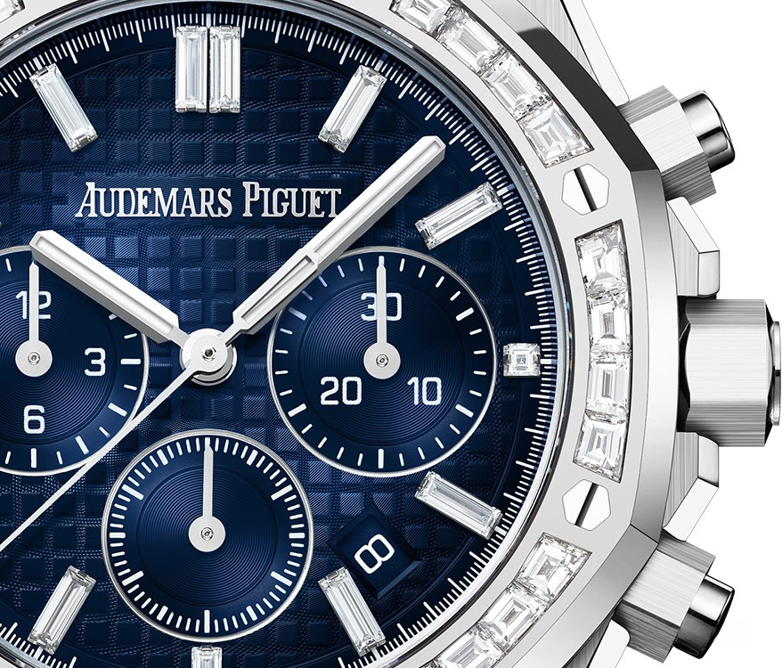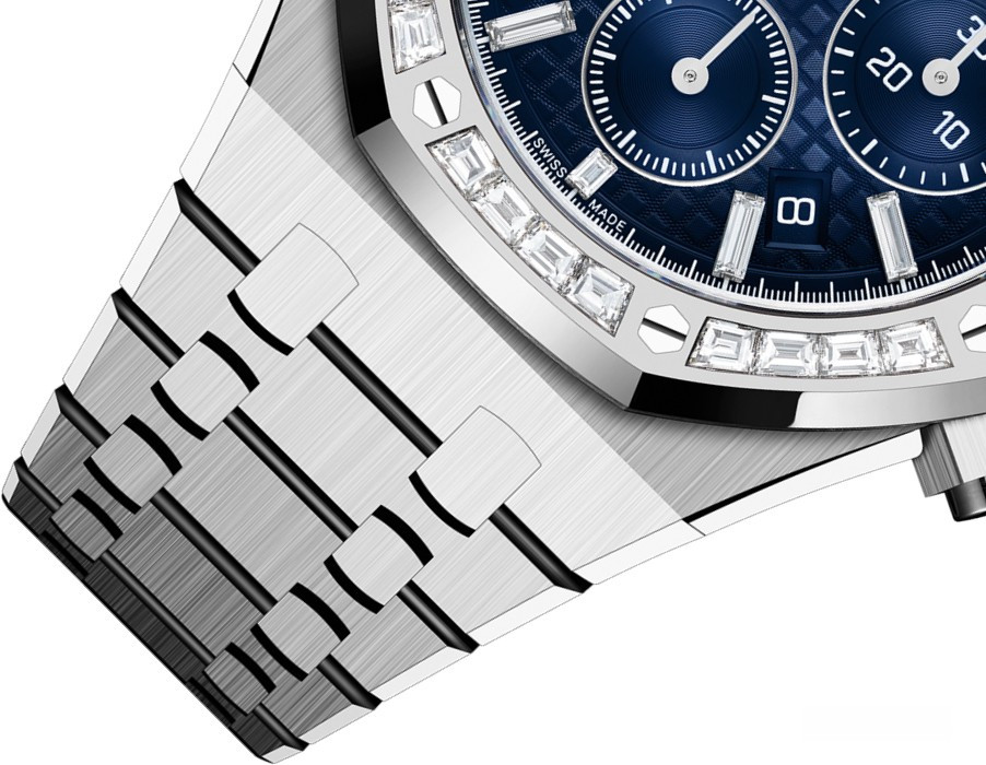 Часы Audemars Piguet Royal Oak Selfwinding Chronograph 38 mm представлены в корпусе размером 38 х 11 мм из белого золота 18к водонепроницаемостью 50 метров. Внутри корпуса установлен автоматический механизм, Калибр AP 2385, обладающий запасом хода 40 часов. На синем гильошированном циферблате с белыми багетными бриллиантами отображаются часы, минуты, секунды, дата. Часы поставляются на браслете из белого золота 18к. Безель из белых багетных бриллиантов.