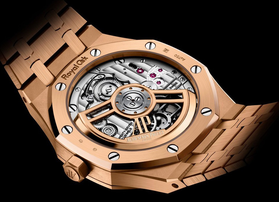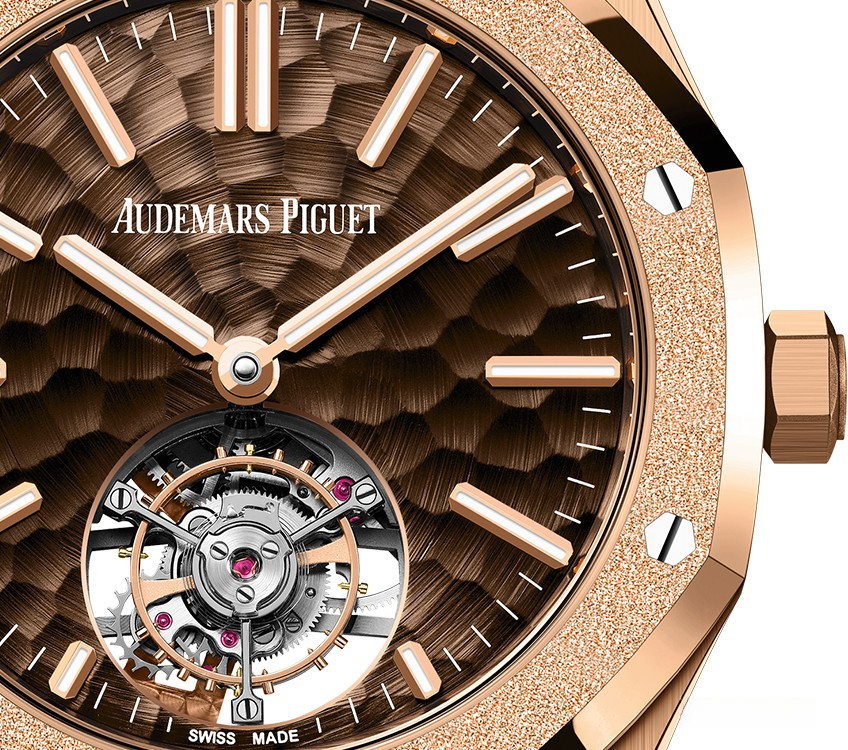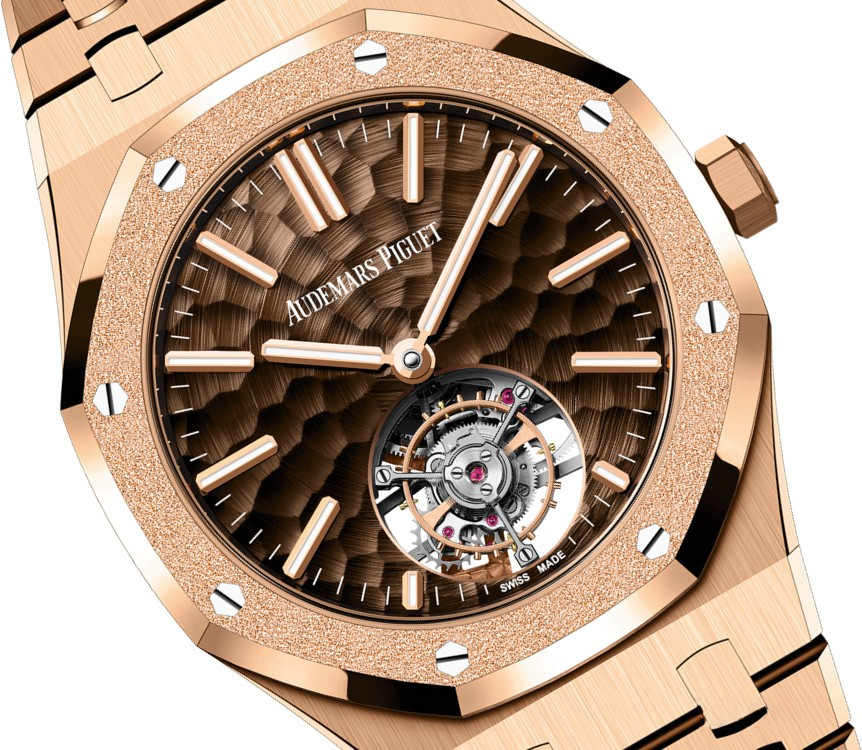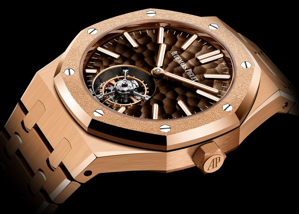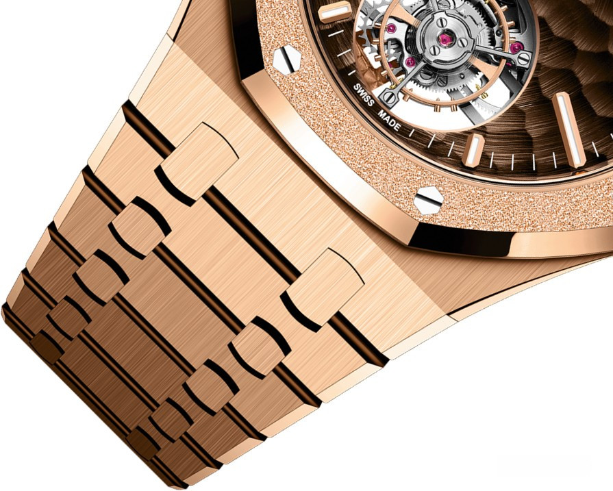 Часы Audemars Piguet Royal Oak Selfwinding Flying Tourbillon представлены в корпусе размером 41 х 10.6 мм из розового золота 18к водонепроницаемостью 50 метров. Внутри корпуса установлен автоматический механизм, Калибр 2950, обладающий запасом хода 65 часов. На коричневом гильошированном циферблате отображаются часы, минуты, турбийон. Часы поставляются с браслетом из розового золота 18к.