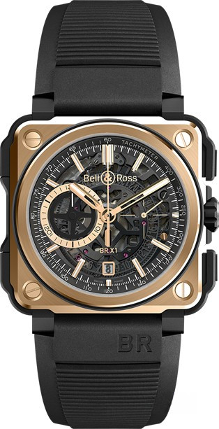 Часы Bell & Ross Experimental BR-X1 Chronographe представлены в корпусе из розового золота 18 к и керамики диаметром 45 мм и водонепроницаемостью 100 метров. Внутри корпуса установлен автоматический механизм, Калибр BR-CAL.313, обладающий запасом хода 42 часа. На черном скелетированном циферблате отображаются часы, минуты, секунды, дата, тахиметр, накопители хронографа. Часы поставляются на каучуковом ремешке с вставкой из нержавеющей стали. Серия ограничена - 99 шт.