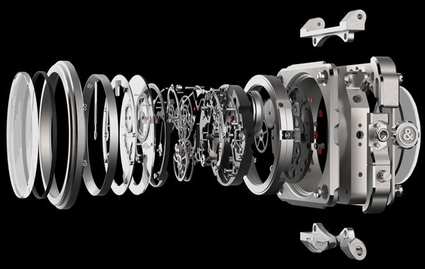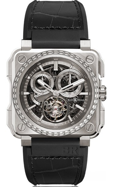 Имея корпус диаметром 45 мм из титана с бриллиантовой инкрустацией на безеле, новая модель BR-X1 оснащена одним из самых (если не более) сложных часовых механизмов, которые когда-либо присутствовали в часах бренда. Часовой механизм особенный по своей структуре: все стандартные элементы хронографа (рычаги, диски, стопперы и шестерни) сосредоточены на лицевой части корпуса – при том, что конструкция не модульная. Разумеется, 60-секундный турбийон по классически размещен в позиции 6 часов, в большой открытой клети, украшенной символом "&" из названия Bell & Ross. Часовой механизм обеспечивает индикацию минут и часов в классическом расположении на центральной оси. Тем не менее, хронограф отображается на двух отдельных суб-циферблатах, расположенных в верхней половине циферблата. Калибр BR-CAL.283 с ручным заводом обеспечивает 100 часов / 4 дня запаса хода с индикатором в позиции 9 часов. И в качестве завершающего штриха: циферблат полупрозрачный, то есть, можно созерцать работу часового механизма, движение колонного колеса и рычагов при нажатии кнопки. Циферблат, зависимо от выбранной версии, соответствует корпусу. Bell & Ross BR-X1 Chronograph Tourbillon Monopusher оснащены каучуковым ремешком со вставкой из кожи аллигатора. Часы выходят лимитированным тиражом в 20 единиц каждая.