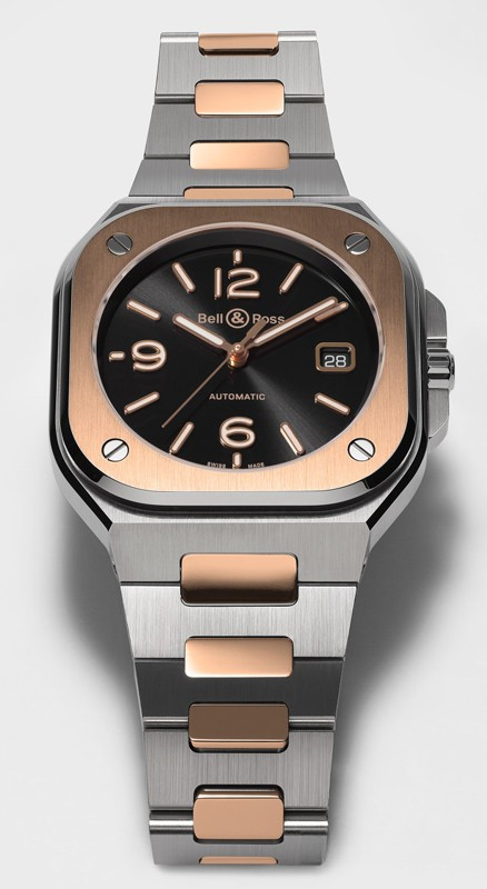 Часы Bell & Ross BR 05 представлены в корпусе из нержавеющей стали и розового золота 18к размером 40 х 11 мм водонепроницаемостью 100 метров. Внутри корпуса установлен автоматический механизм, Калибр BR-CAL.321, обладающий запасом хода 42 часа. На черном циферблате отображаются часы, минуты, секунды, дата. Часы поставляются на браслете из нержавеющей стали и розового золота 18к.
