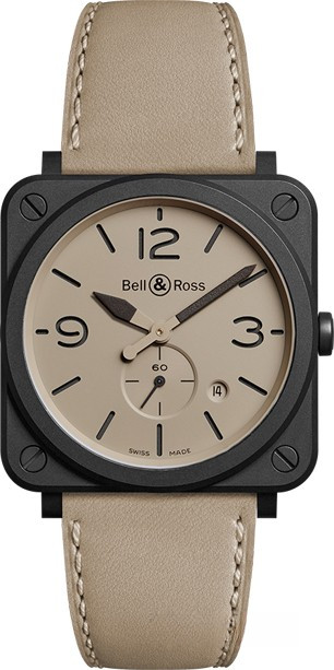Часы Bell & Ross BR S Quartz представлены в корпусе диаметром 39 мм из керамики с водонепроницаемостью до 100 метров. Внутри корпуса установлен кварцевый механизм, Калибр BR-CAL.102, поддерживающий функции часов и минут. Циферблат бежевого цвета, индикация времени осуществляется при помощи центральных стрелок, малая секундная стрелка расположена на 6-ти часах, апертура даты расположена на 4-х часах. Часы комплектуются кожаным ремешком с вставкой из нержавеющей стали.