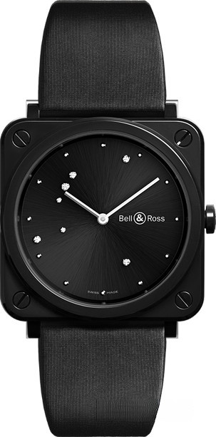 Часы Bell & Ross BR S Quartz представлены в корпусе диаметром 39 мм из керамики с водонепроницаемостью до 100 метров. Внутри корпуса установлен кварцевый механизм, Калибр BR-CAL.102, поддерживающий функции часов и минут. Циферблат черного цвета, белые бриллианты, индикация времени осуществляется при помощи центральных стрелок. Часы комплектуются сатиновым ремешком с вставкой из нержавеющей стали.