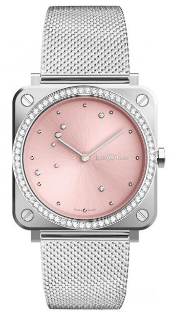 Часы Bell & Ross BR S Diamond Eagle представлены в корпусе диаметром 39 мм из нержавеющей стали с водонепроницаемостью до 100 метров. Внутри корпуса установлен кварцевый механизм, Калибр BR-CAL.102, поддерживающий функции часов и минут. Розовый циферблат украшают белые бриллианты, индикация времени осуществляется при помощи центральных стрелок. Часы комплектуются браслетом из нержавеющей стали. Безель из белых бриллиантов.
