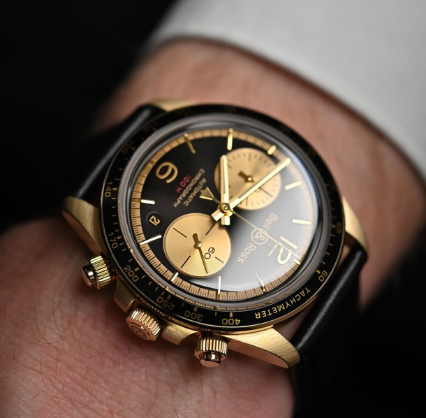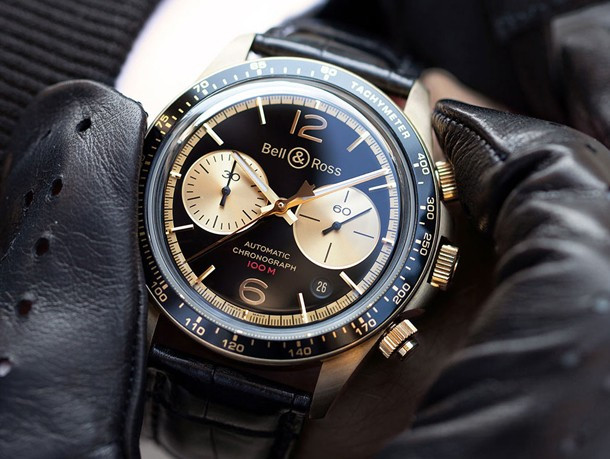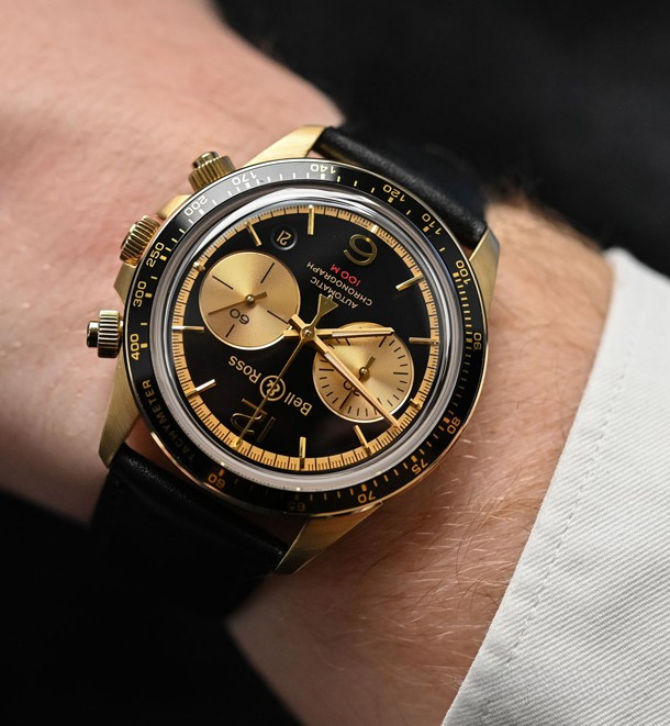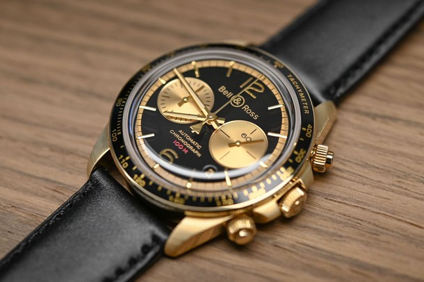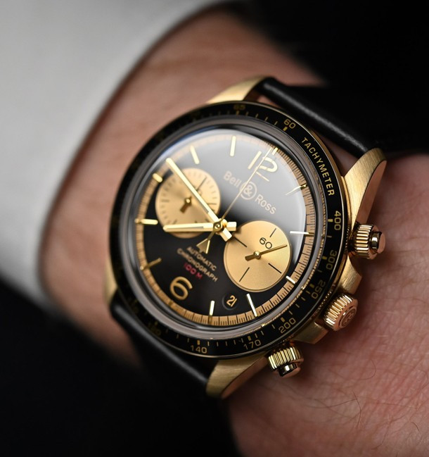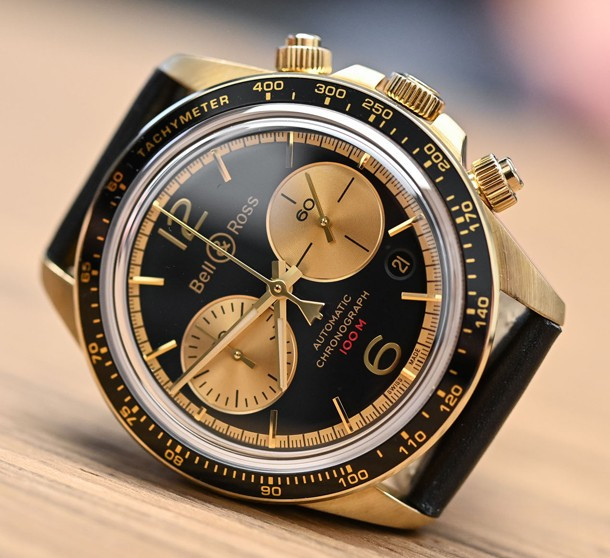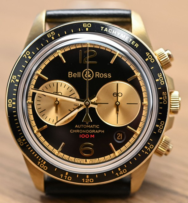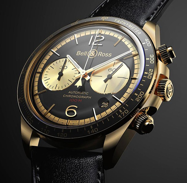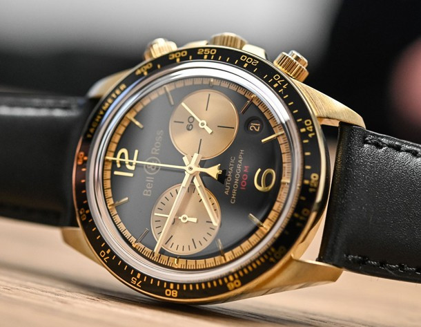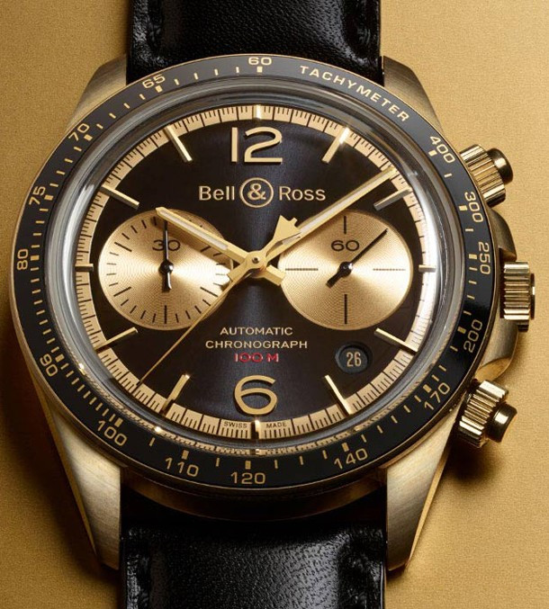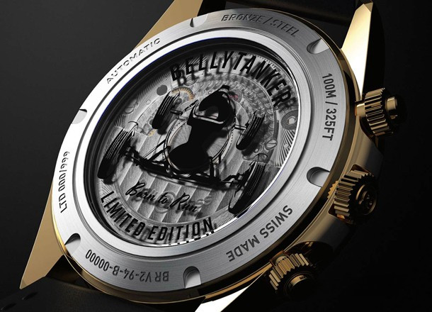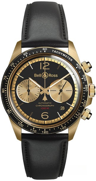 Компания Bell & Ross представила новый хронограф BR V2-94 Bellytanker Bronze в бронзовых и черных тонах. И 41-миллиметровый корпус, и безель изготовлены из бронзы CuAI7Si2, также известной как алюминиевая бронза. Безель имеет вставку из анодированного алюминия с тахиметрической шкалой. Кнопки хронографа, также как и заводная головка, завинчиваются для повышения водонепроницаемости, которая составляет 100 метров. Черный циферблат с золотистыми счетчиками хронографа защищен сапфировым стеклом с антибликовым покрытием. Накопители хронографа расположены на 3-х и 9-ти часах. Циферблат дополнен накладными цифрами и индексами. Стрелки покрыты Super LumiNova. Дата незаметно расположилась между 4 и 5 часами. Задняя крышка из сапфирового стекла позволяет взглянуть на работу механизма. Автоматический Калибр BR-CAL.301 4 Гц обеспечивает запас хода 41 час. Часы комплектуются ремешком из черной телячьей кожи с бронзовой застежкой. Bell & Ross BR V2-94 Bellytanker Bronze BRV294-BC-BR/SCA выпущены ограниченной серией 999 штук.