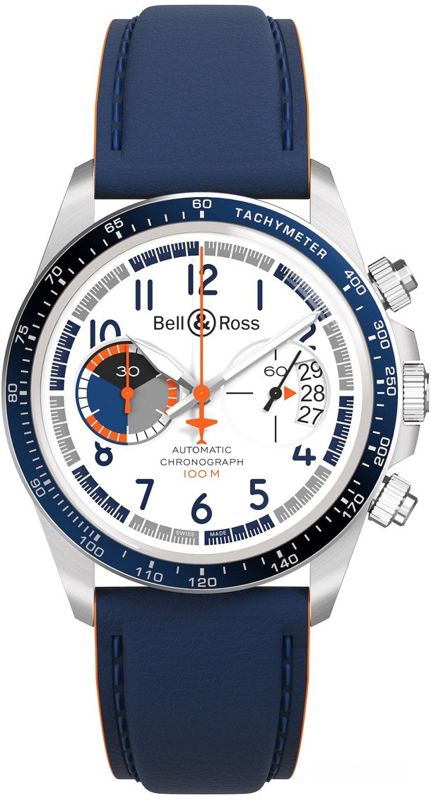 Часы BR V2-94 Racing Bird Chronograph обладают стальным корпусом диаметром 41 мм. На белом циферблате отображаются два счетчика хронографа – 30-минутный и 60-секундный. На циферблат нанесены четкие арабские цифры, дополнительным украшением служат синие, серые и оранжевые акценты. Апертура даты расположена на 3-х часах и вмещает в себя сразу три значения. Racing Bird Chronograph выгладит спортивно и современно. Часы комплектуются автоматическим механизмом BR-CAL.301, созданным на базе ETA 2894-2. Новинка выпущена ограниченной серией 999 штук. Хронограф BR V2-94 Racing Bird поставляется на кожаном ремешке с вставкой из нержавеющей стали.