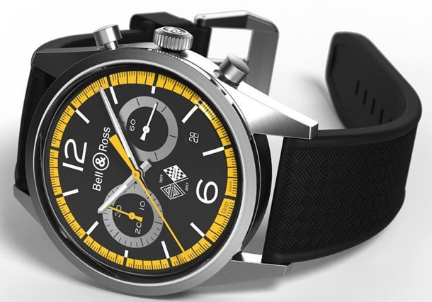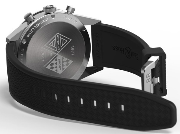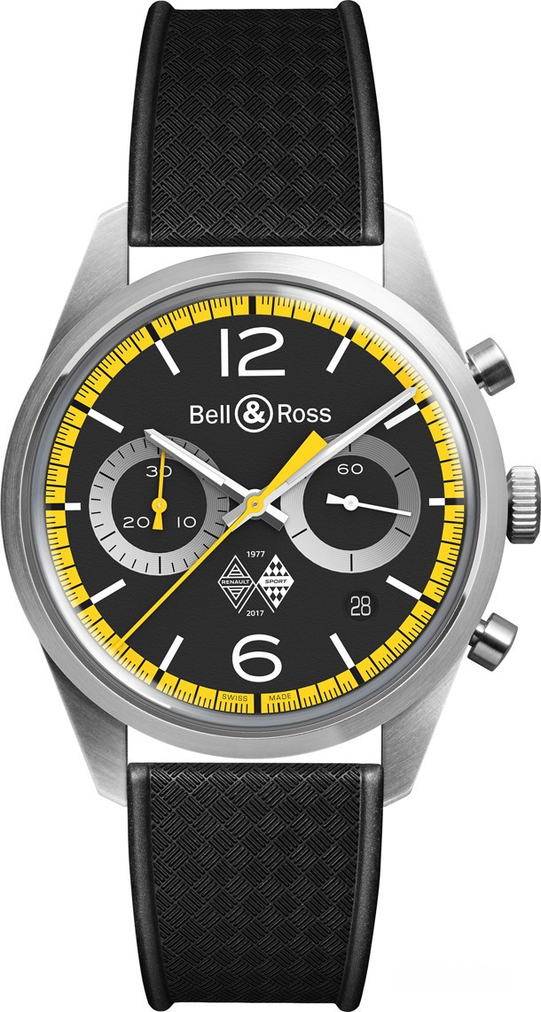 В честь 40-й годовщины Renault Sport в Formula 1 Bell & Ross создали часы, вдохновленные первым гоночным автомобилем Renault 1977 года - R.S.01. Винтажная модель переносит нас в мир гонок благодаря особому вдохновению от «скоростного ДНК» Формулы 1. Стальной сатинированный корпус диаметром 41 мм обрамляет черны й циферблат с желтыми акцентами в виде минутной шкалы, центральной секундной стрелки и маленькой стрелки хронографа на 9-ти часах. Черный и желтый – цвета команды Renault Sport Formula One™. Все индикаторы расположены очень органично на циферблате, что улучшает читаемость хронографа. В часах есть функция таймера. Это усложнение было изобретено для измерения коротких отрезков времени. Внутри корпуса находится автоматический механизм BR-CAL.301. Часы комплектуются черным каучуковым ремешком. Цвета новинки, выпуклое стекло, каучуковый ремешок и форма ушек придают винтажный вид этим часам. Над 6-ю часами расположен логотип команды Renault, который использовался в 70-х. Он также нанесен в виде гравировки на заднюю крышку часов.