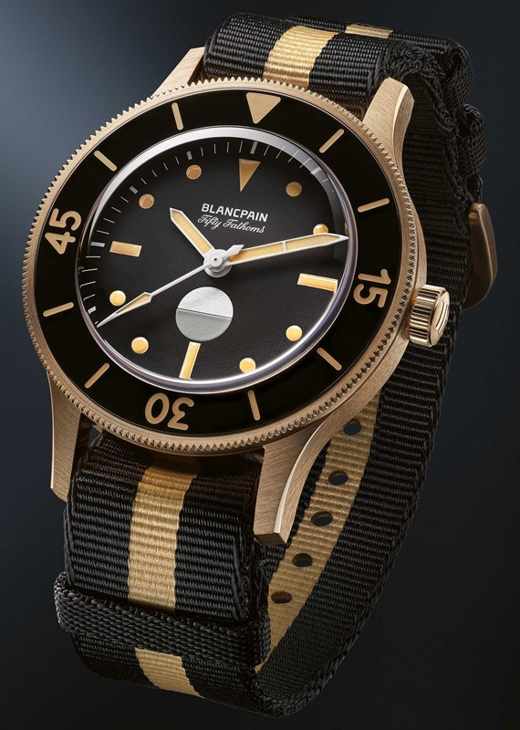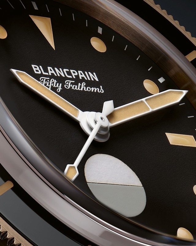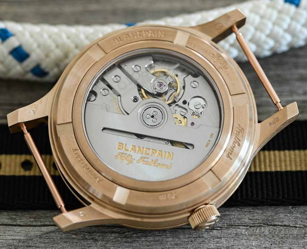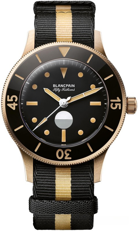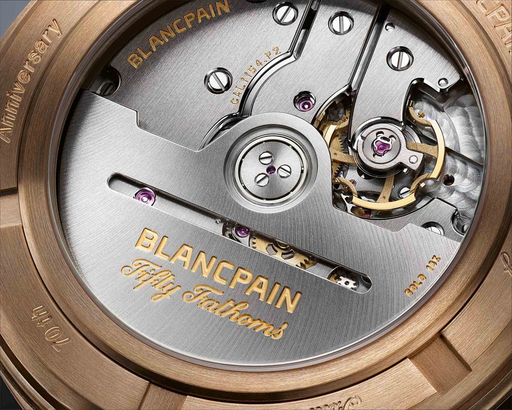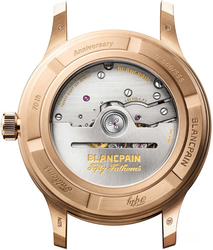 Часы Blancpain Fifty Fathoms 70th Anniversary представлены в корпусе размером 41.3 х 13.3 мм из бронзового золота 9к водонепроницаемостью 300 метров. Внутри корпуса установлен автоматический механизм, Калибр 1154 Р2, обладающий запасом хода 100 часов. На черном циферблате отображаются часы, минуты, секунды, индикатор влажности. Часы поставляются на текстильном ремешке с бронзовой застежкой. Серия ограничена - 555 штук.