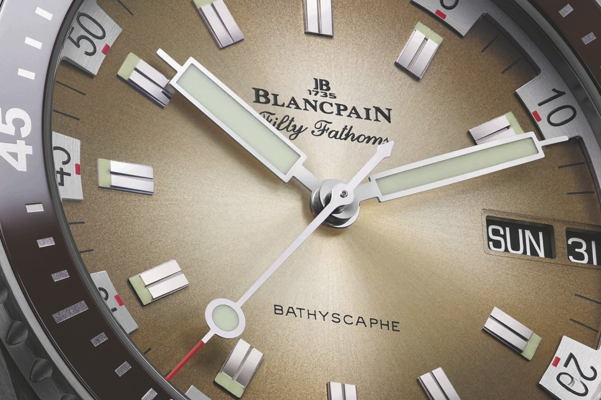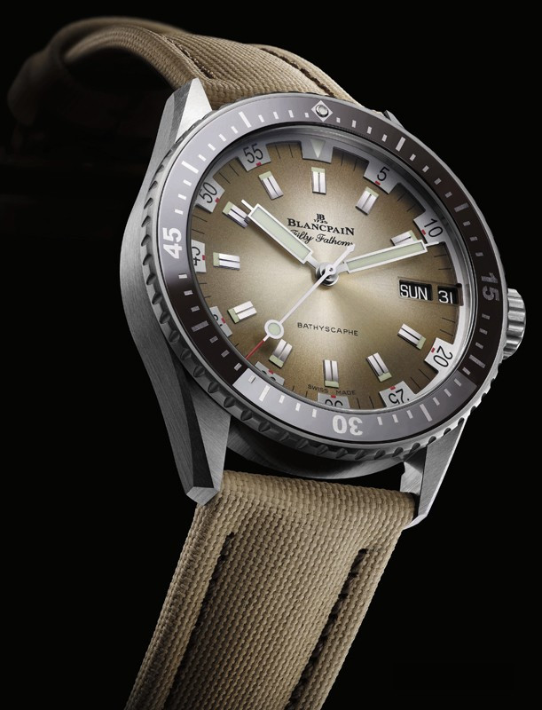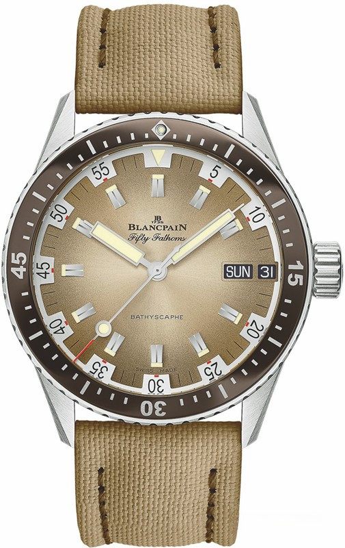 Часы Blancpain Fifty Fathoms Day Date Desert Edition облеклись в дизайн 1970-х годов. Циферблат с эмалью fume, большие квадратные маркеры и стрелки позволяют весьма ярко передать модели того периода. Часы выпущены ограниченной серией 500 экземпляров с циферблатом песочно-бежевого цвета и соответствующим ремешком из парусины. Песочно-бежевый циферблат с матовым финишем более светлый по центру, темнеет к периферии. Внутри корпуса установлен автоматический механизм, Калибр Blancpain 1315DD, обладающий запасом хода 5 дней.