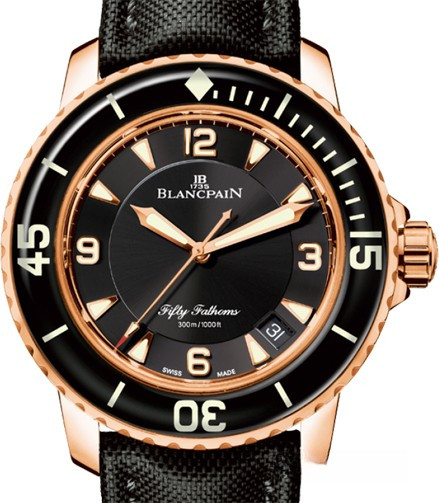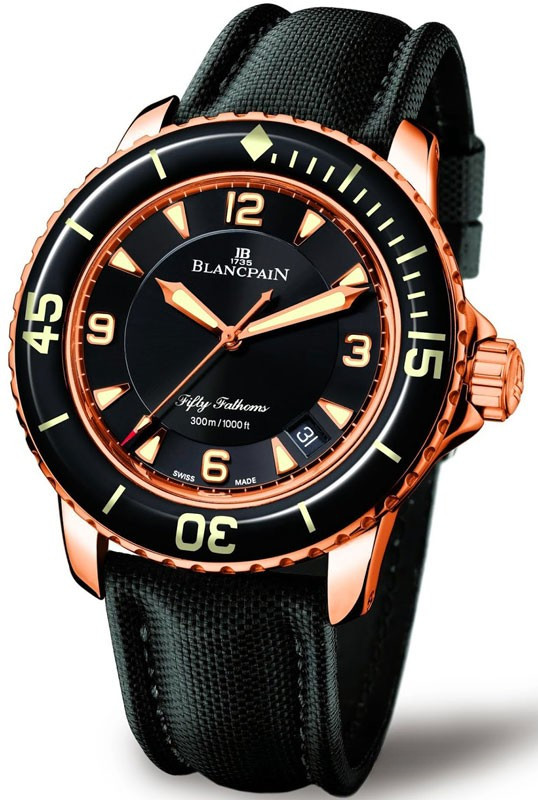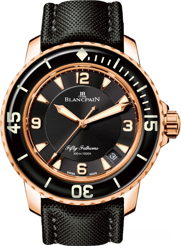Водостойкие часы Blancpain Fifty Fathoms 'Fifty Fathoms' Automatique 5015-3630-52 выпущены в круглом корпусе из розового золота, 18к. Размер составляет 45 х 15,5 мм, водонепроницаемость 300 м, корпус с вращающимся безелем. Внутри корпуса установлен автоматический механизм, Калибр Blancpain 1315. Обеспечивающий запас хода 120 часов. На черном циферблате отображаются часы, минуты, секунды, дата. Часы комплектуются ремешком из кевлара с золотой, 18к вставкой.