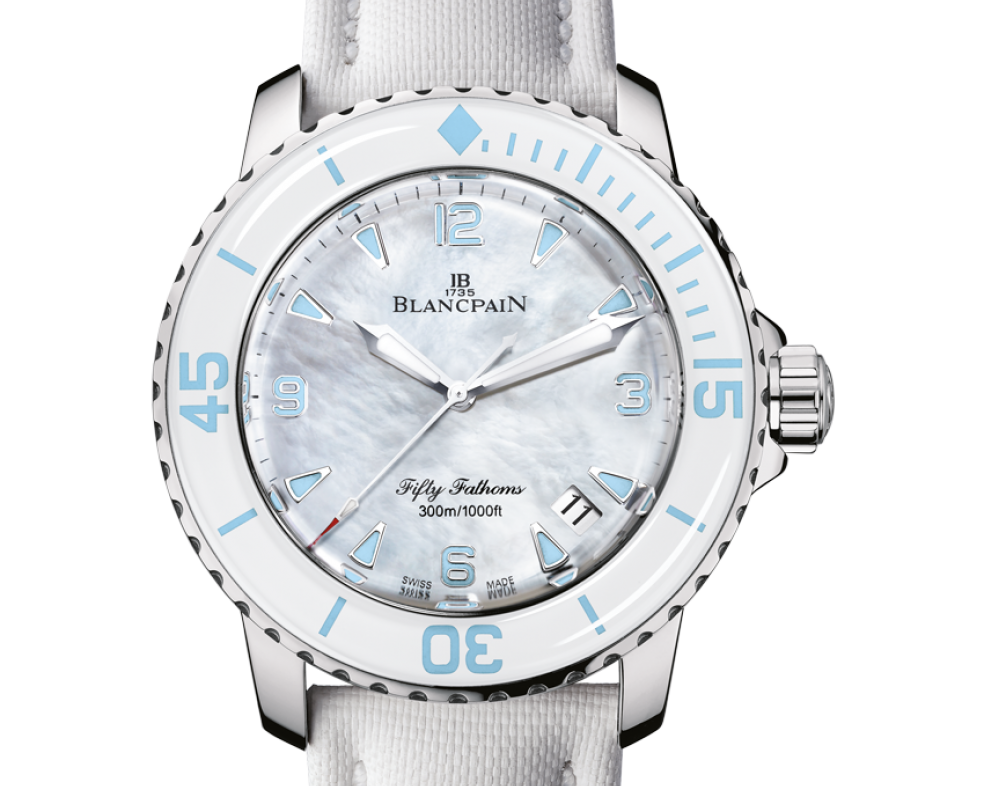 Водостойкие часы Blancpain Fifty Fathoms 'Fifty Fathoms' Automatique 5015A-1144-52A выпущены в круглом корпусе из нержавеющей стали и керамики. Размер составляет 45 х 15,5 мм, водонепроницаемость 300 м, корпус с вращающимся безелем. Внутри корпуса установлен автоматический механизм, Калибр Blancpain 1315. Обеспечивающий запас хода 120 часов. На белом жемчужном циферблате отображаются часы, минуты, секунды, дата. Часы комплектуются текстильным ремешком с вставкой из нержавеющей стали.