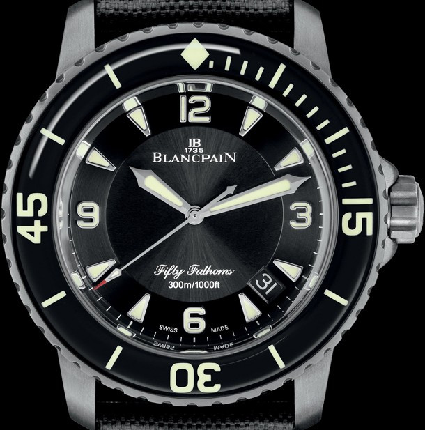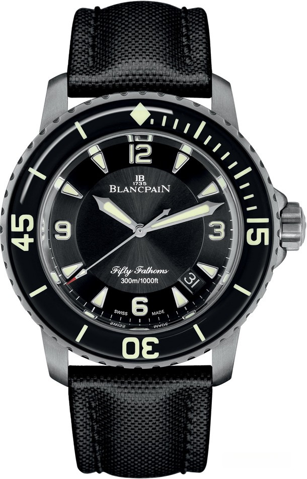 Водостойкие часы Blancpain Fifty Fathoms 'Fifty Fathoms' Automatique выпущены в круглом корпусе из титана. Размер составляет 45 х 15,4 мм, водонепроницаемость 300 м, корпус с вращающимся безелем. Внутри корпуса установлен автоматический механизм, Калибр Blancpain 1315, обеспечивающий запас хода 120 часов. На черном циферблате отображаются часы, минуты, секунды, дата. Часы комплектуются текстильным ремешком с вставкой из нержавеющей стали.
