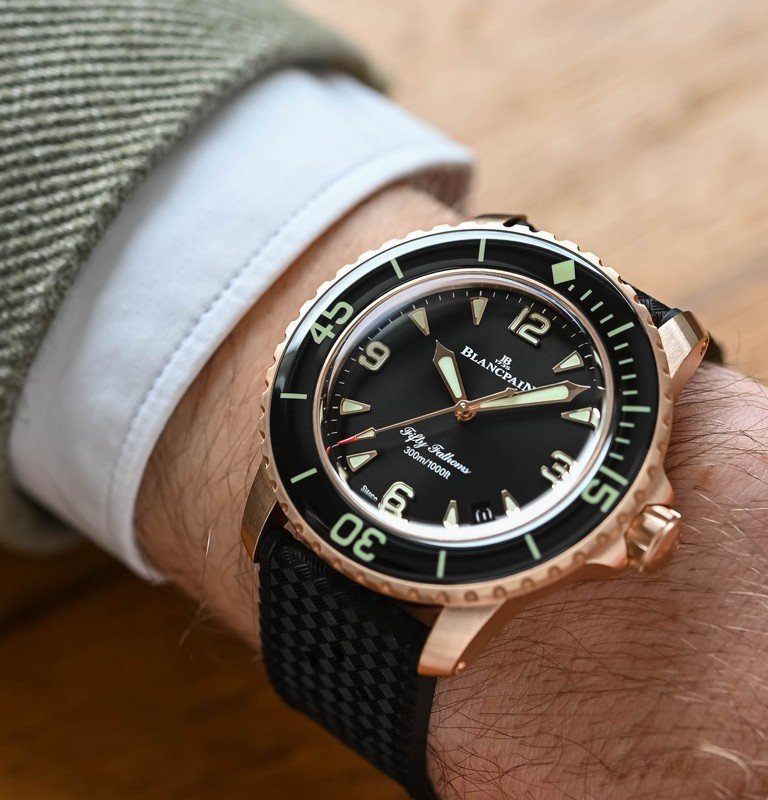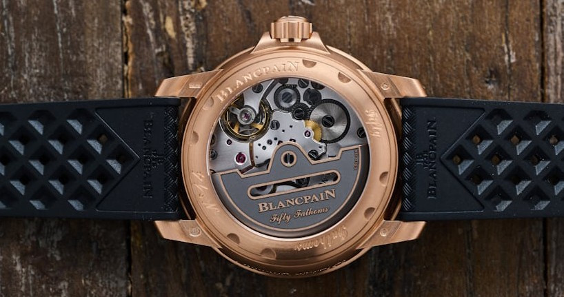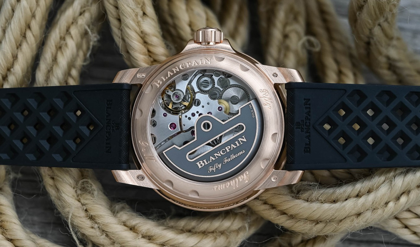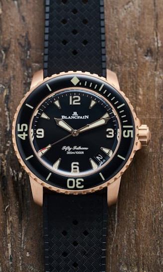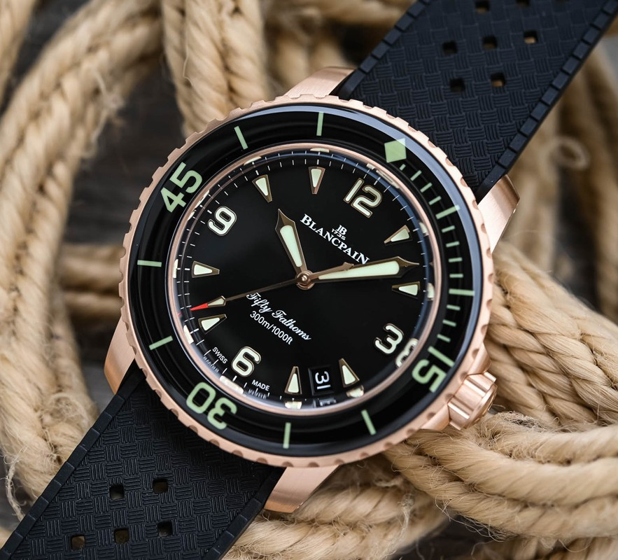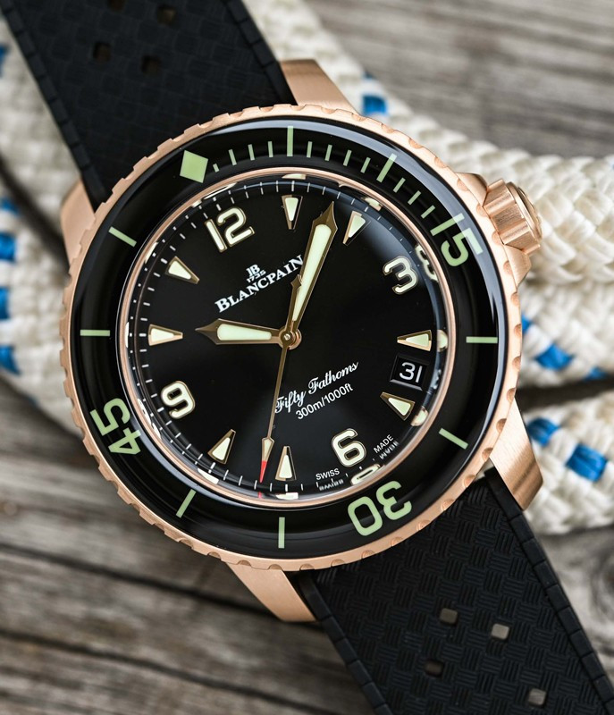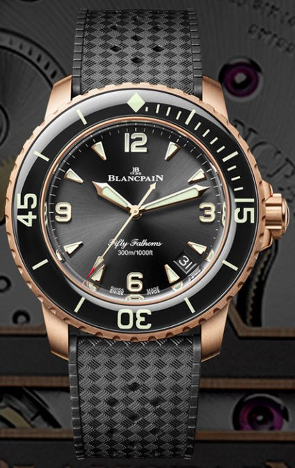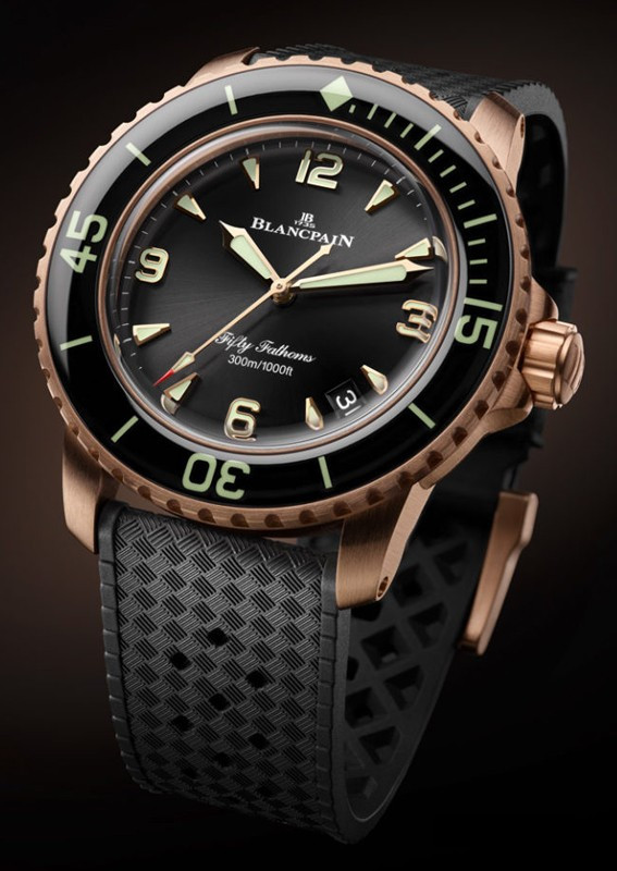 Часы Blancpain Fifty Fathoms Fifty Fathoms Automatique 5010 представлены в корпусе размером 42 мм из розового золота 18к водонепроницаемостью 300 метров. Внутри корпуса установлен автоматический механизм, Калибр 1315, обладающий запасом хода 120 часов. На черном циферблате отображаются часы, минуты, секунды, дата. Часы поставляются на каучуковом ремешке с золотой застежкой.