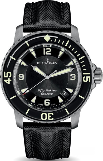 Водостойкие часы Blancpain Fifty Fathoms 'Fifty Fathoms' Automatique выпущены в круглом корпусе из титана. Размер составляет 45 х 15,4 мм, водонепроницаемость 300 м, корпус с вращающимся безелем. Внутри корпуса установлен автоматический механизм, Калибр Blancpain 1315, обеспечивающий запас хода 120 часов. На черном циферблате отображаются часы, минуты, секунды, дата. Часы комплектуются текстильным ремешком с вставкой из нержавеющей стали.