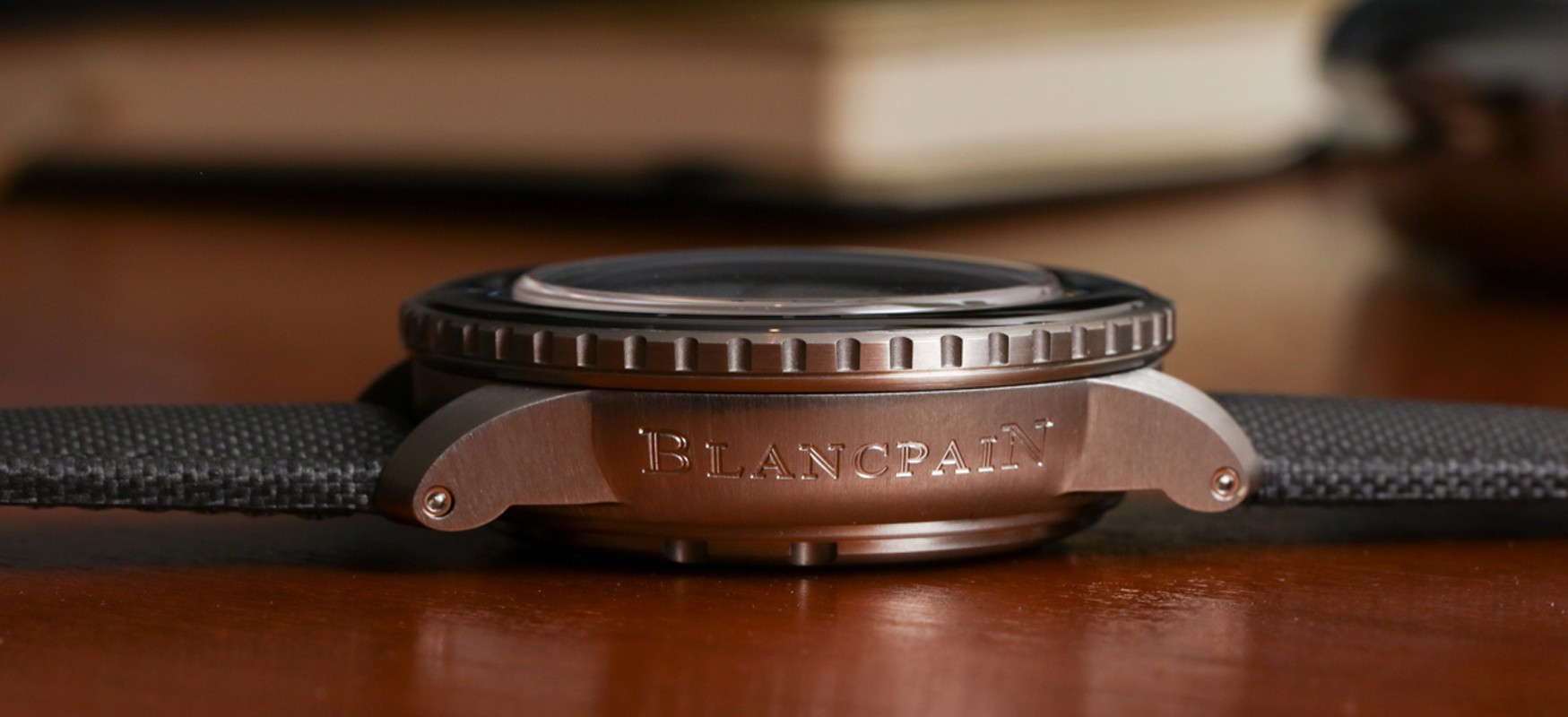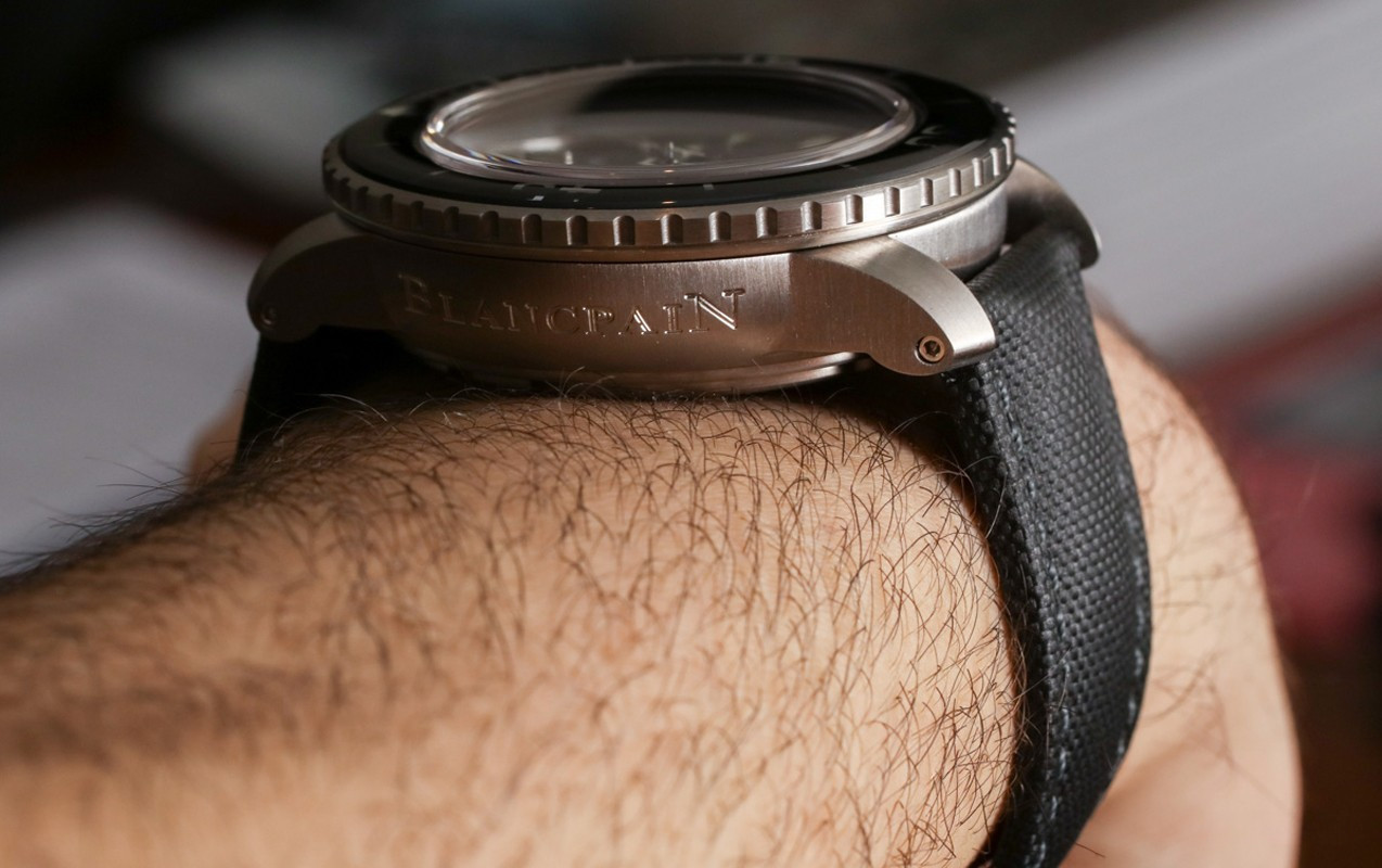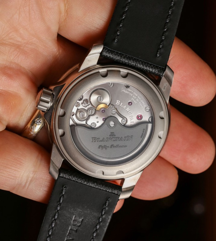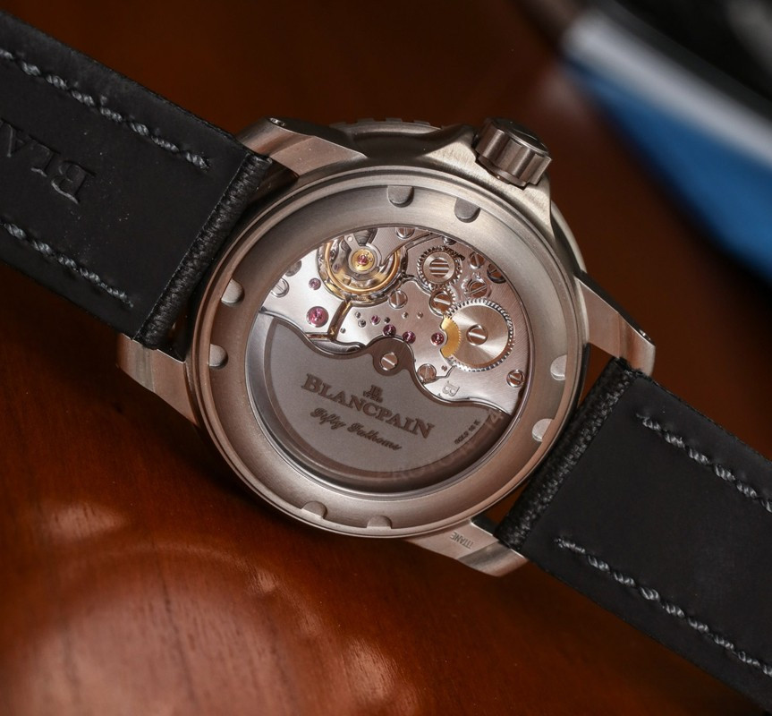 Водостойкие часы Blancpain Fifty Fathoms 'Fifty Fathoms' Automatique Grande Date выпущены в круглом корпусе из титана. Размер составляет 45 х 16.27 мм, водонепроницаемость 300 м, корпус с вращающимся безелем. Внутри корпуса установлен автоматический механизм, Калибр Blancpain 6918B, обеспечивающий запас хода 8 дней. На черном циферблате отображаются часы, минуты, секунды, дата. Часы комплектуются текстильным ремешком с титановой вставкой.