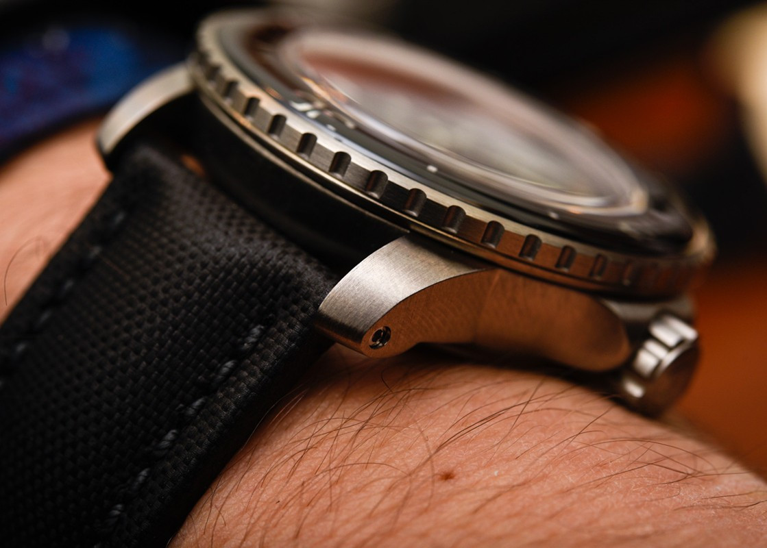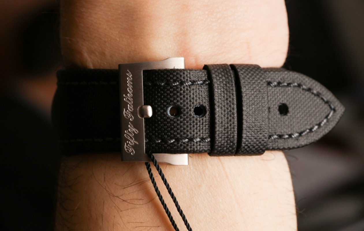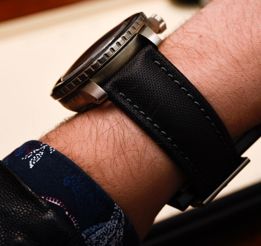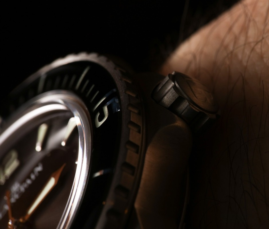 Водостойкие часы Blancpain Fifty Fathoms 'Fifty Fathoms' Automatique Grande Date выпущены в круглом корпусе из титана. Размер составляет 45 х 16.27 мм, водонепроницаемость 300 м, корпус с вращающимся безелем. Внутри корпуса установлен автоматический механизм, Калибр Blancpain 6918B, обеспечивающий запас хода 8 дней. На черном циферблате отображаются часы, минуты, секунды, дата. Часы комплектуются текстильным ремешком с титановой вставкой.