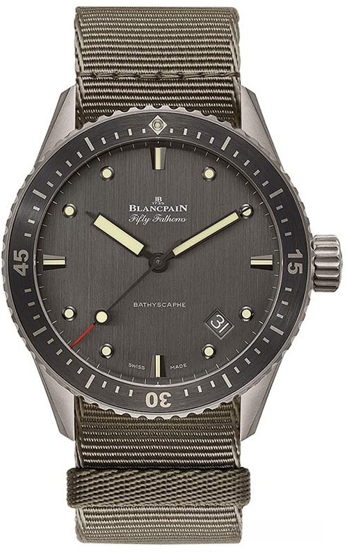 Водостойкие часы Blancpain Fifty Fathoms 'Fifty Fathoms' Bathyscaphe выпущены в круглом корпусе из титана. Размер составляет 43 х 13.45 мм, водонепроницаемость 300 м, корпус с вращающимся безелем. Внутри корпуса установлен автоматический механизм, Калибр Blancpain 1315, обеспечивающий запас хода 120 часов. На сером циферблате отображаются часы, минуты, секунды, дата. Часы комплектуются текстильным ремешком с титановой застежкой.