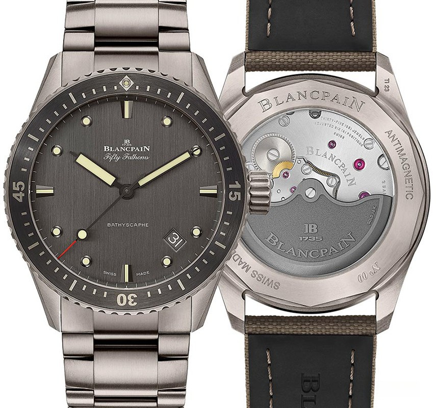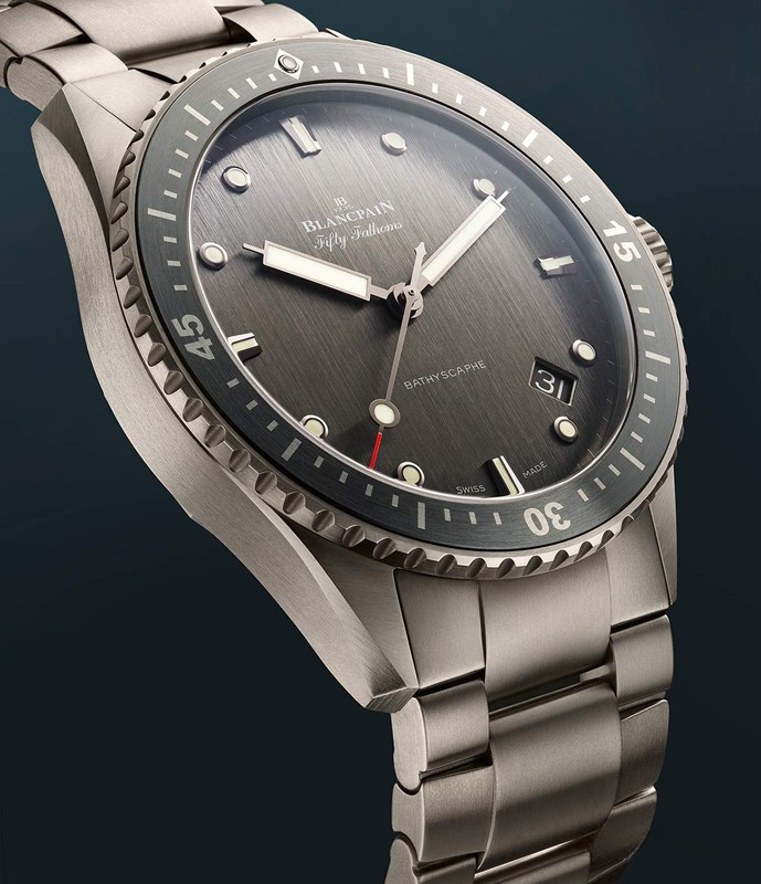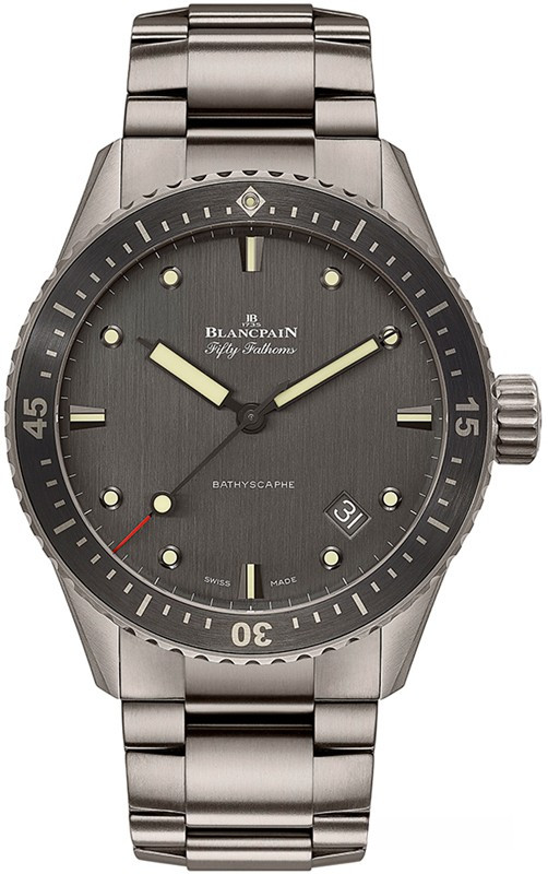 Водостойкие часы Blancpain Fifty Fathoms 'Fifty Fathoms' Bathyscaphe выпущены в круглом корпусе из титана. Размер составляет 43 х 13.45 мм, водонепроницаемость 300 м, корпус с вращающимся безелем. Внутри корпуса установлен автоматический механизм, Калибр Blancpain 1315, обеспечивающий запас хода 120 часов. На сером циферблате отображаются часы, минуты, секунды, дата. Часы комплектуются браслетом из титана.