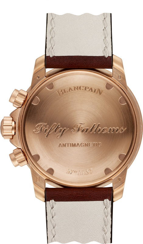 Водостойкие часы Blancpain Fifty Fathoms 'Fifty Fathoms' Flyback Chronograph 5085FA-3630-63B с хронографом выпущены в круглом корпусе из розового золота, 18к. Размер составляет 45 х 15,5 мм, водонепроницаемость 300 м, корпус с вращающимся безелем. Внутри корпуса установлен автоматический механизм, Калибр Blancpain F185, обеспечивающий запас хода 40 часов. На черном циферблате отображаются часы, минуты, секунды, дата. Часы комплектуются кожаным ремешком с вставкой из розового золота 18к и раскладывающейся застежкой.