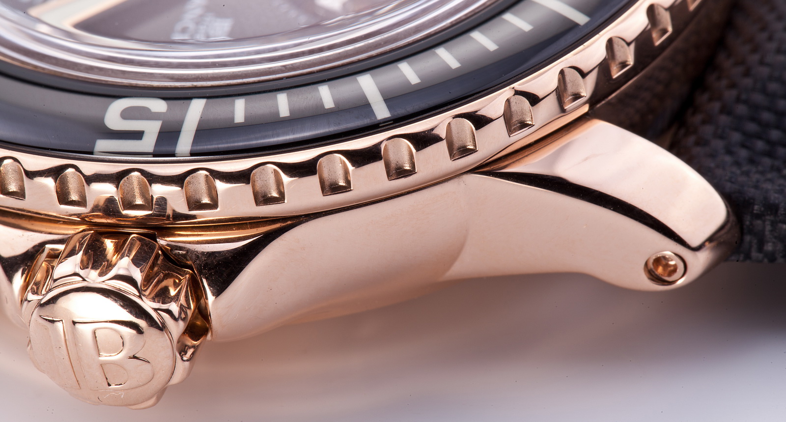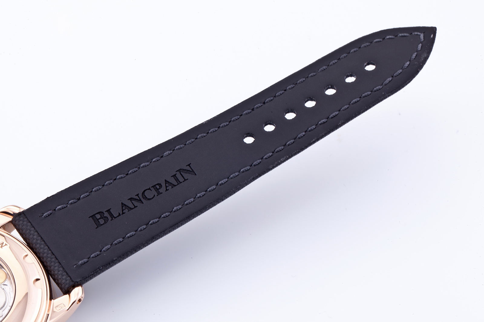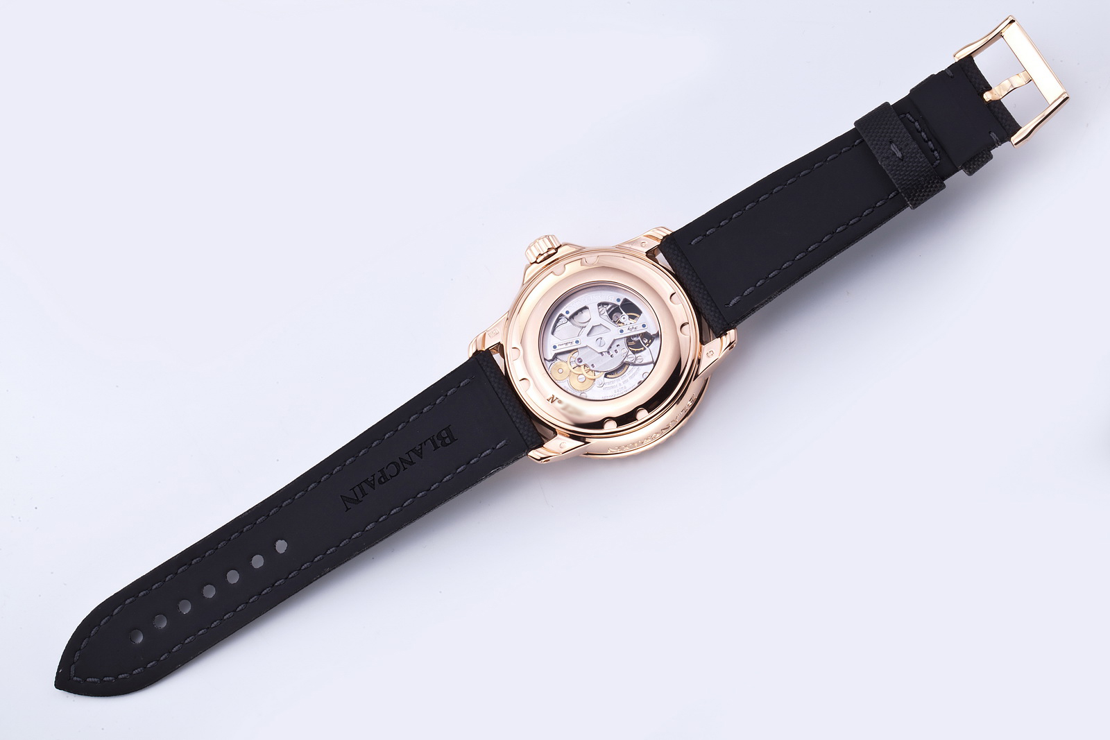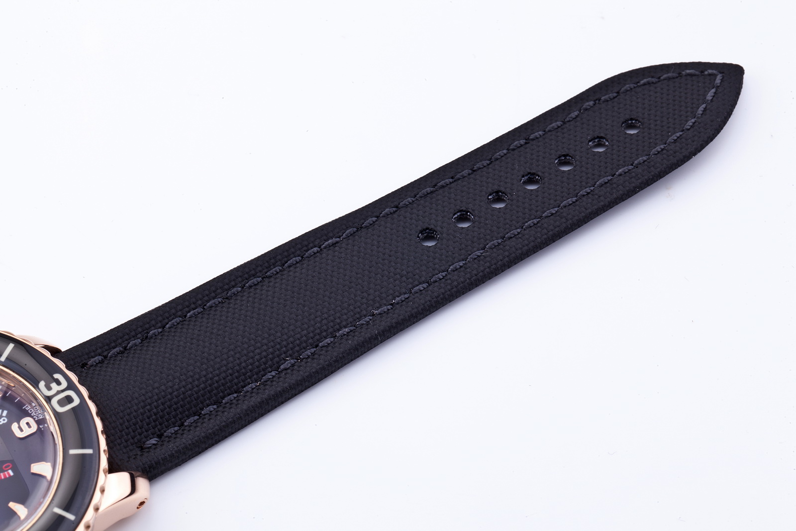 Водостойкие часы Blancpain Fifty Fathoms 'Fifty Fathoms' Tourbillon 5025-3630-52A с турбийоном выпущены в круглом корпусе из розового золота 18к. Размер составляет 45 х 14,75 мм, водонепроницаемость 300 м, корпус с вращающимся безелем. Внутри корпуса установлен автоматический механизм, Калибр Blancpain 25A, обеспечивающий запас хода 7 дней. На черном циферблате отображаются часы, минуты, секунды, запас хода. Часы комплектуются ремешком из кевлара с золотой, 18к вставкой.