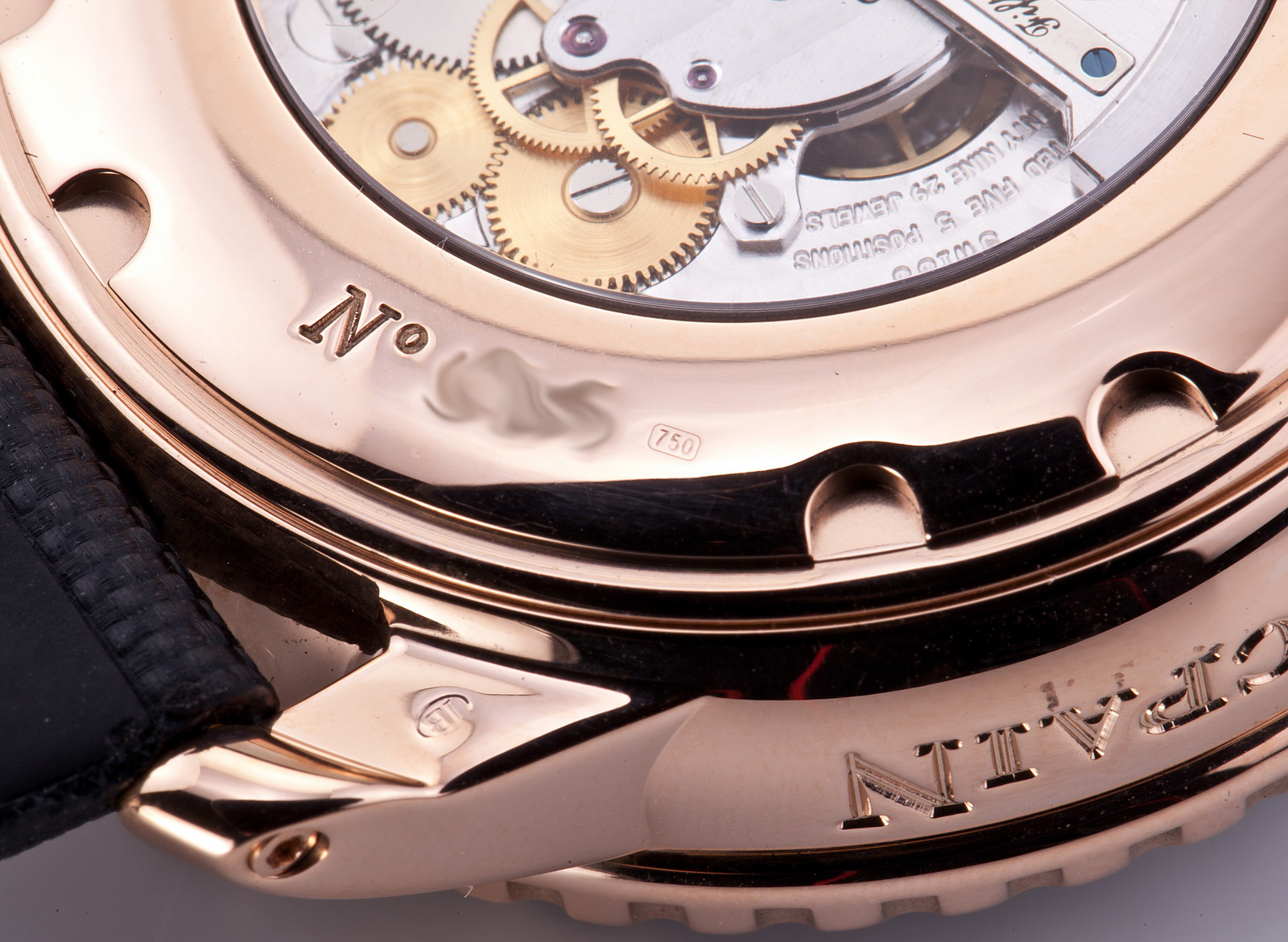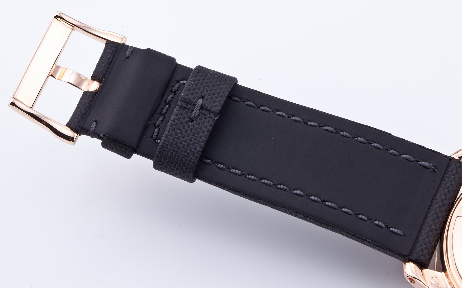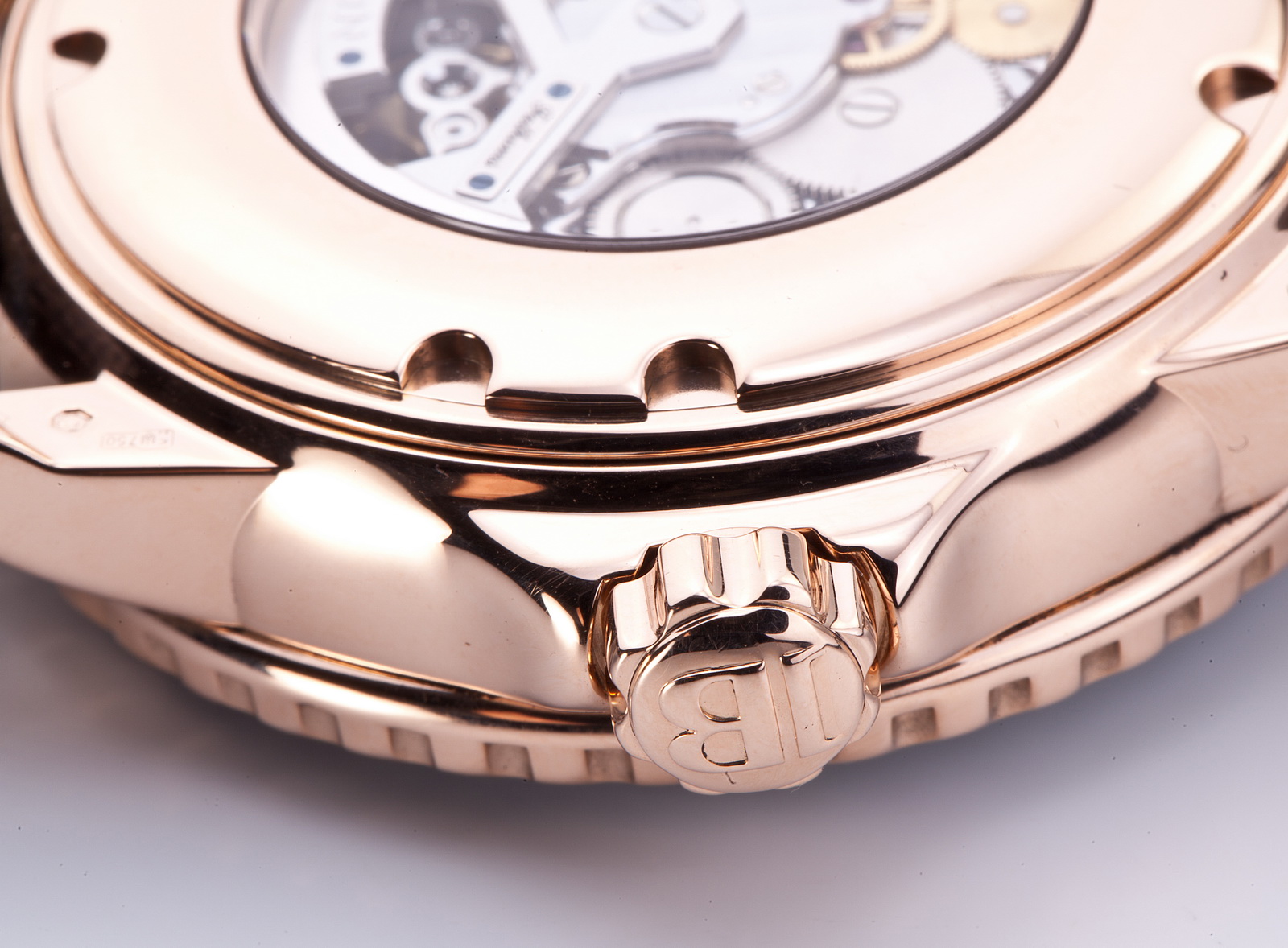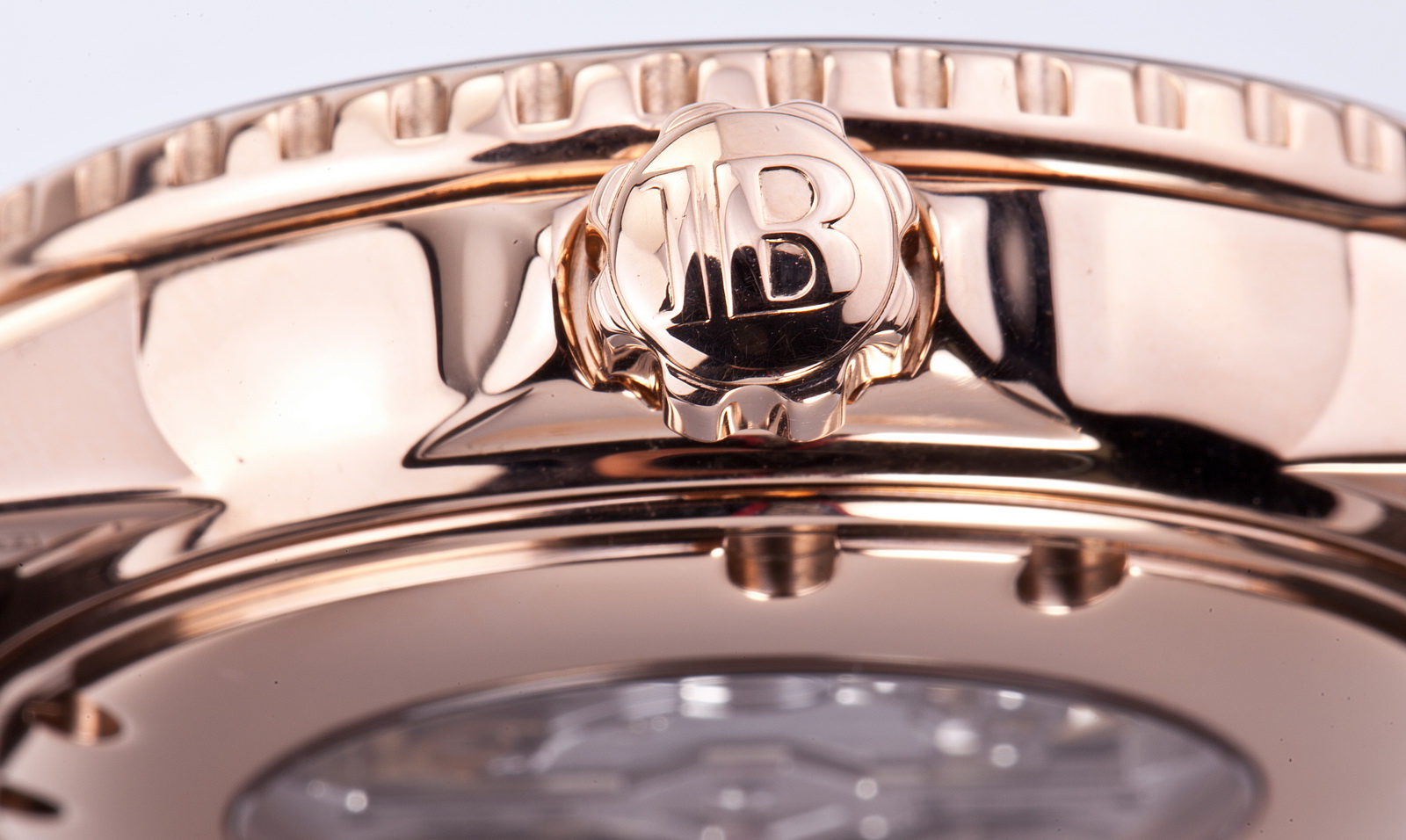 Водостойкие часы Blancpain Fifty Fathoms 'Fifty Fathoms' Tourbillon 5025-3630-52A с турбийоном выпущены в круглом корпусе из розового золота 18к. Размер составляет 45 х 14,75 мм, водонепроницаемость 300 м, корпус с вращающимся безелем. Внутри корпуса установлен автоматический механизм, Калибр Blancpain 25A, обеспечивающий запас хода 7 дней. На черном циферблате отображаются часы, минуты, секунды, запас хода. Часы комплектуются ремешком из кевлара с золотой, 18к вставкой.