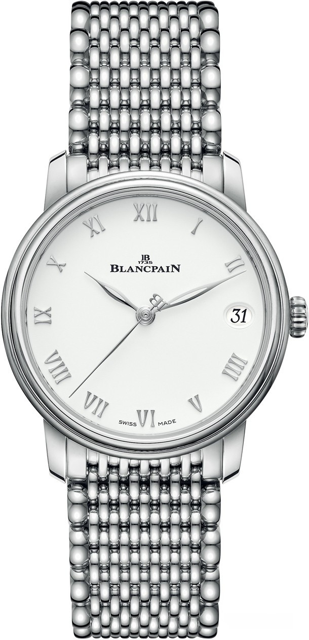 Часы Blancpain Villeret Date представлены в корпусе из нержавеющей стали размером 33.2 х 9.15 мм и водонепроницаемостью 30 метров. Внутри корпуса установлен автоматический механизм, Калибр 1151, обладающий запасом хода 95 часов. На белом циферблате отображаются часы, минуты, секунды, дата. Часы поставляются на браслете из нержавеющей стали.