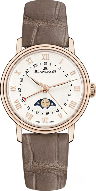 Модель Villeret Quantieme Moon Phase выполнена из розового золота 18к, в диаметре 29.2 мм и толщиной 10.36 мм. Механизм с автоматическим заводом, Калибр Blancpain 6654, с запасом хода 72 часа. Циферблат серебристый. Центральная часовая, минутная и секундная стрелки, стрелка с наконечником показывает дату, индикатор фазы Луны в положении 6 часов. Часы комплектуются коричневым ремешком из кожи аллигатора с вставкой из розового золота 18к. Водонепроницаемость 30 метров.
